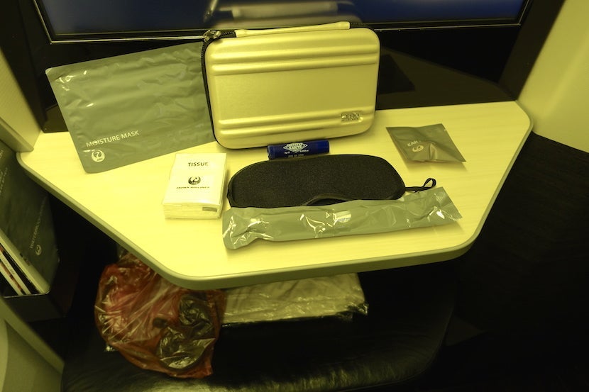 Shortly after I boarded, a flight attendant came by with a metallic Zero Halliburton amenity kit. It was stocked with the basics like tissues, earplugs, a dental kit and eye mask and some lip balm, but no other skincare products.