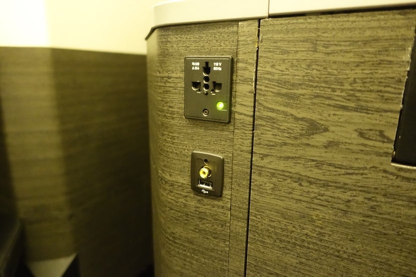 The seat had a universal power plug and a USB port just under the ledge that ran along the side toward the aisle. I could set my phone on the ledge while it charged, though I had to put my laptop on the counter under my IFE monitor while it charged since the ledge was not deep enough to support it.