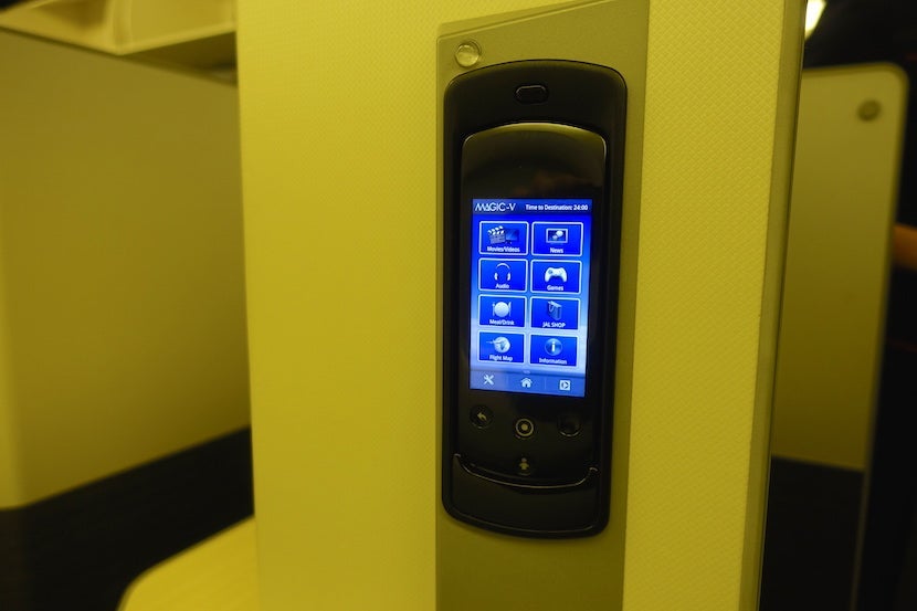 The high-definition in-flight entertainment screens in JAL business class measure in at an industry-leading 23 inches. Though they technically are touch screens, they're too far away to use conveniently like that. Fortunately, each seat has a touchscreen handset that stows in the side console.