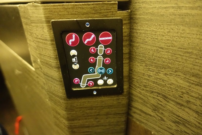 Each seat is 25.5 inches wide and reclines to a 74-inch bed. They have a narrow armrest on either the window or aisle side, depending on where you're sitting. On the other is a panel with buttons to control the various parts of the seat, including the privacy divider and a massage function, plus three preset positions for being upright, lounging or sleeping.