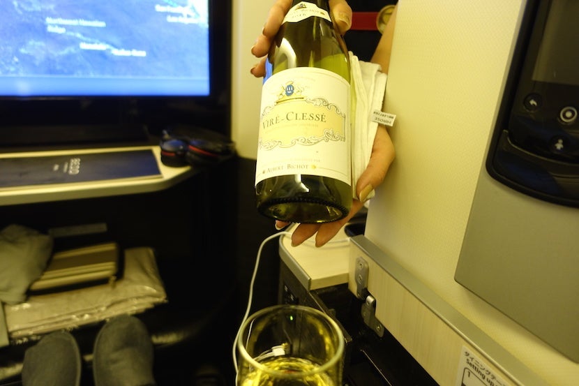 While boarding was still going on, the flight attendant taking care of my section brought me a glass of Delamotte Blanc de Blancs Champagne and the food and wine menus. Like many Asian airlines, JAL offers Asian and Western menus, but unfortunately you can't mix and match dishes from the two. The flight attendant came back during taxi to take my order — I opted for the Japanese menu.