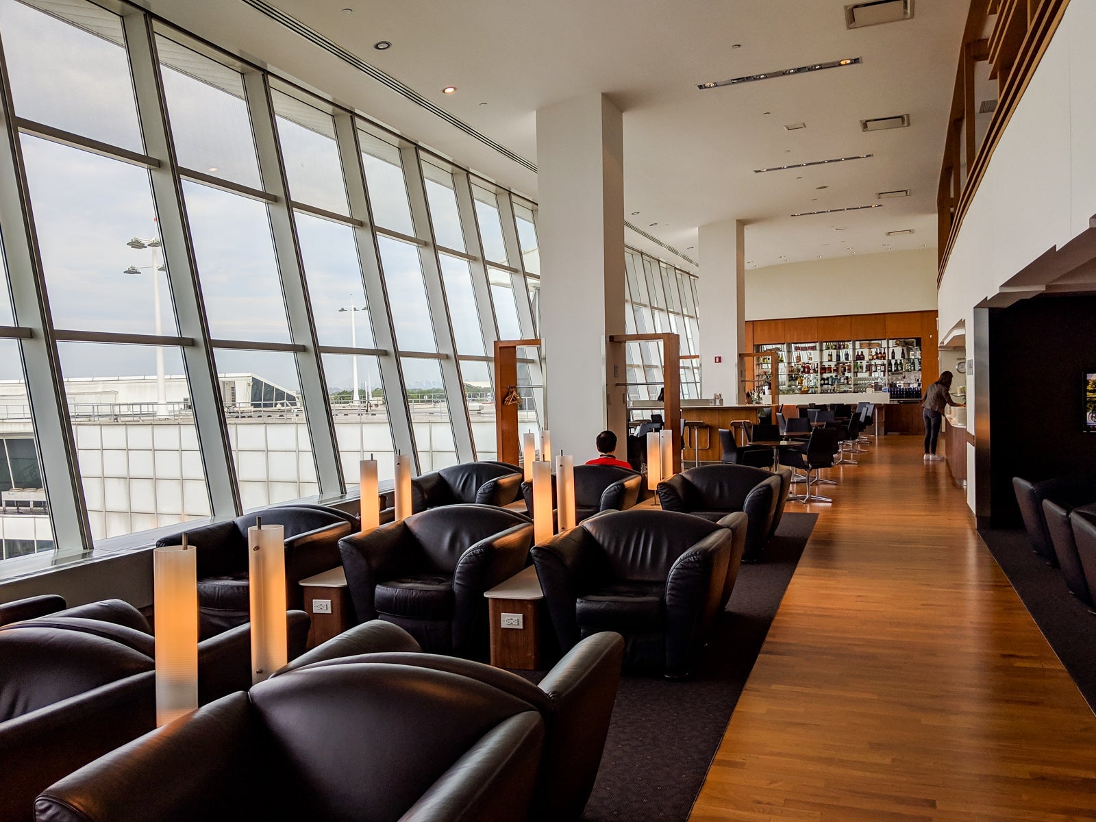 Now before you get all excited, this was not the Lufthansa first-class terminal of lore at Frankfurt Airport. Instead, it was a two-floor space, one for business and one for first class, with mediocre food and drinks.