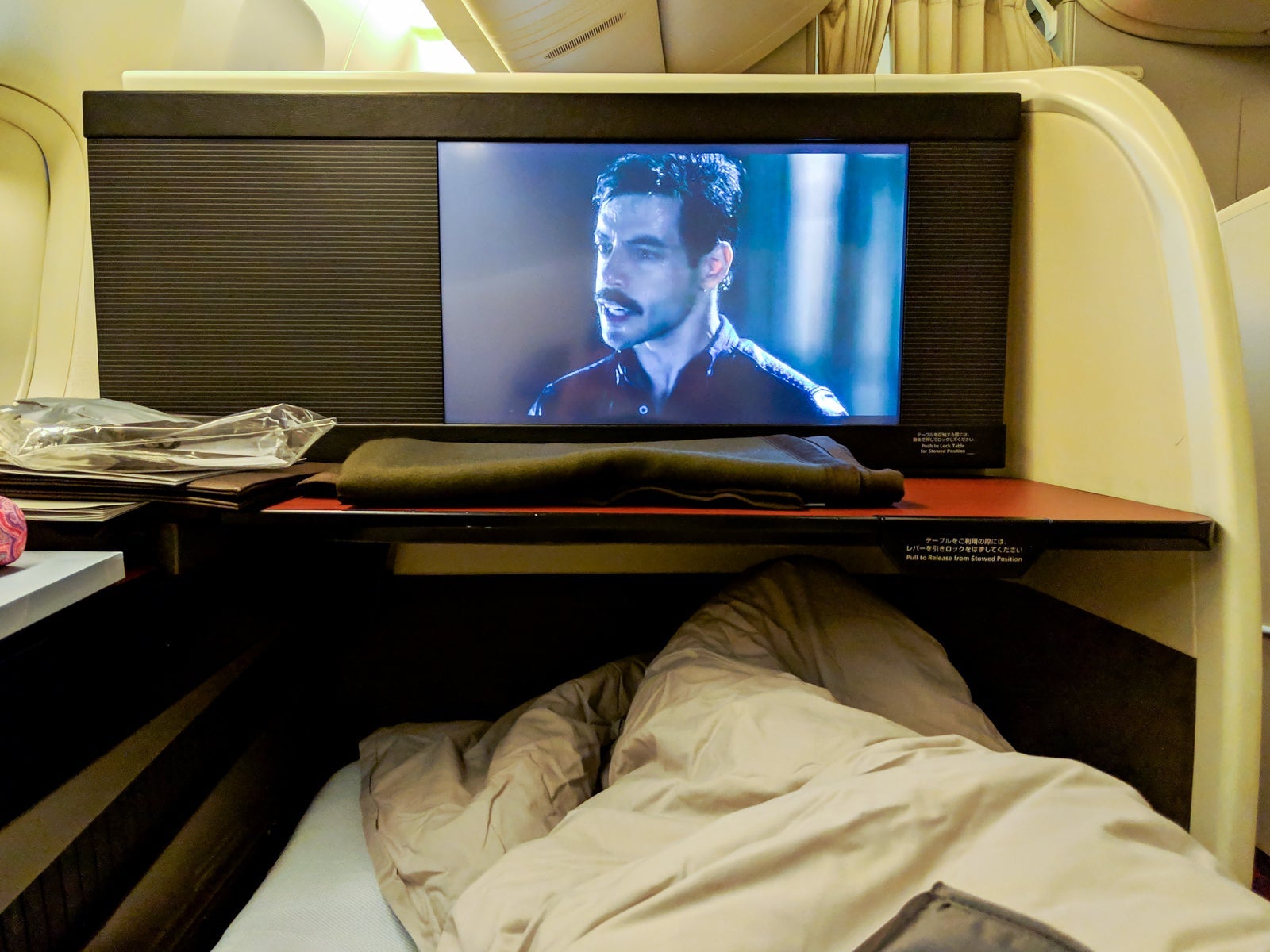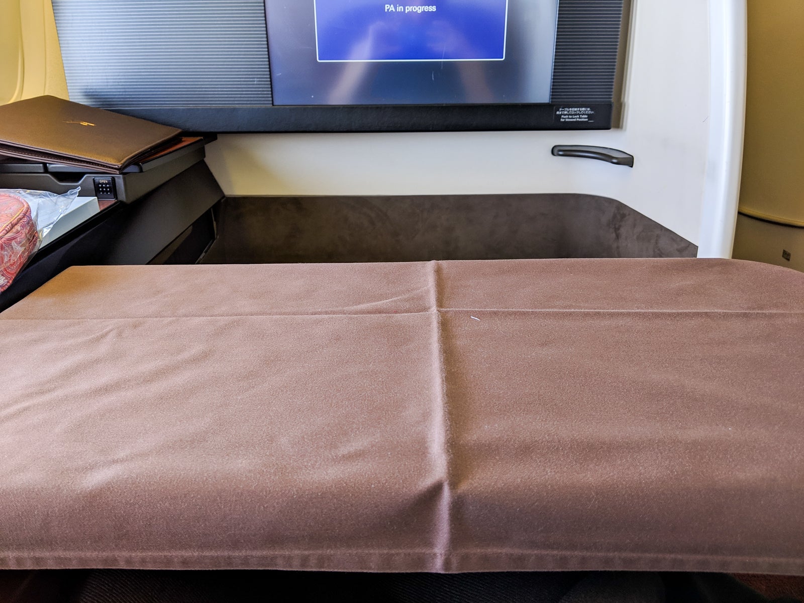 The mattress pad itself was comfortable, but it was so weird to me that it was just that ... a mattress pad. There was no cover sheet, and the mattress pad would move around, since it wasn't secured in any way. First World problems, I know, but this flight wasn't cheap no matter how you looked at it, so of course I wanted the best of the best. This was the biggest shortcoming of the experience.