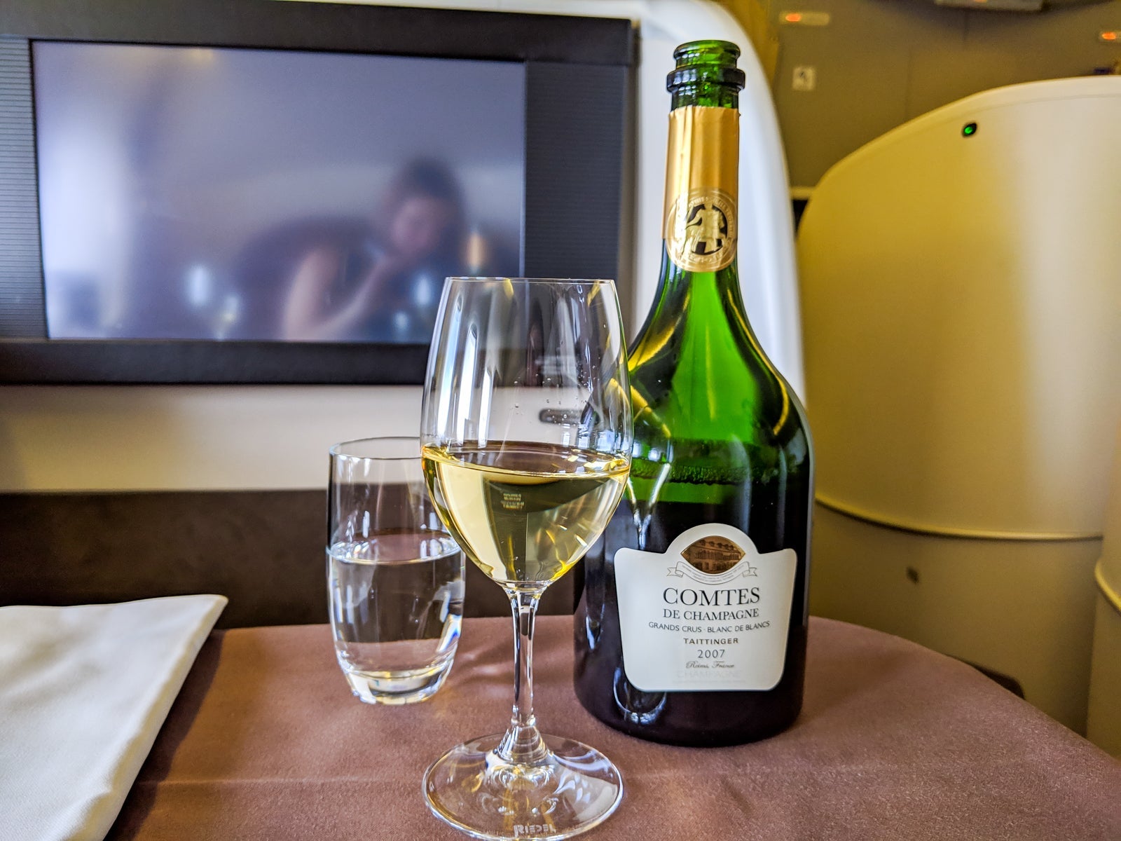 [flight_stats ticket-class="first" review-stat-section="Food and Beverage" tpg-rating="24" tpg-rating-max="25" live-tv="0" tailcam="0" headphones="0" meals="2" champagne="Louis Roederer Cristal 2009, among others" dine-on-demand="Yes" comp-alcohol="0" extra-pillows="0" turndown-service="0" /]
