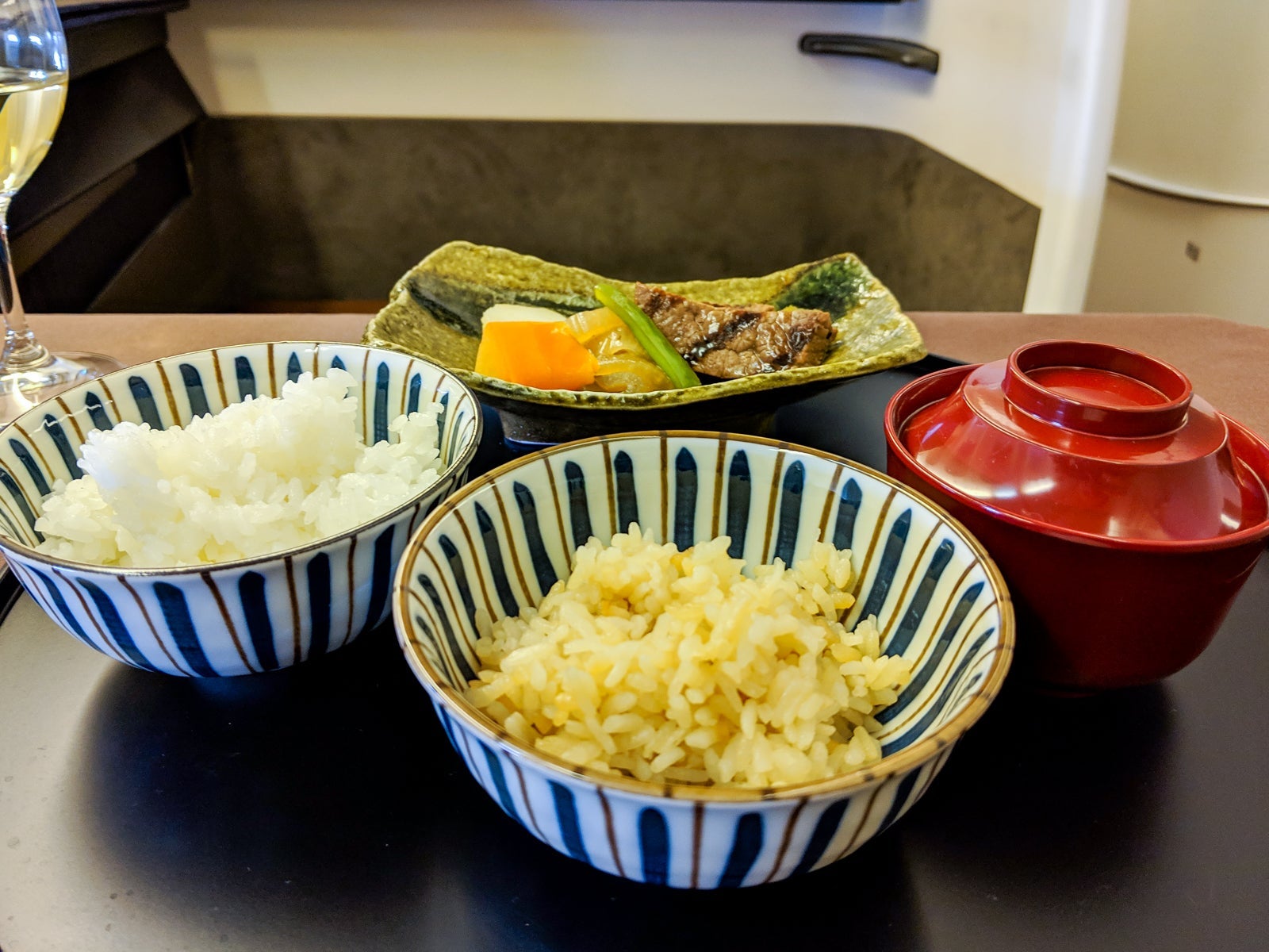 Dainomono was sukiyaki-style beefsteak. It was a little on the bland side and definitely could have been warmer. For hanmono, they offered a choice of ginger rice or steamed rice. I asked the flight attendant which one she preferred, to which she said, "I prefer the ginger, but I'll bring both for you!" First class has its perks — and yes, she was right about the ginger rice.