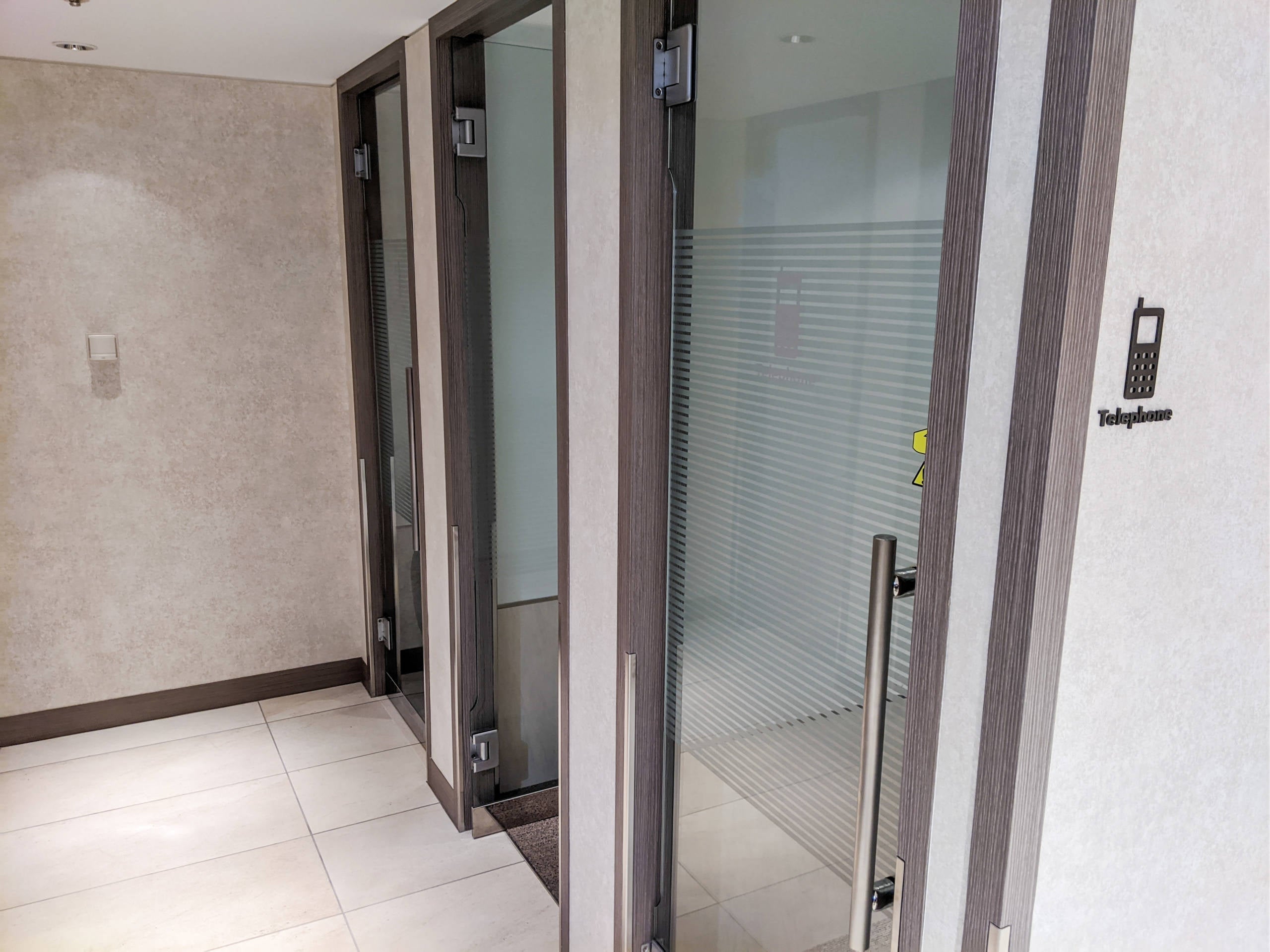 If you turn to the left, you'll see a hallway to the left. This hallway leads to phone rooms and restrooms.