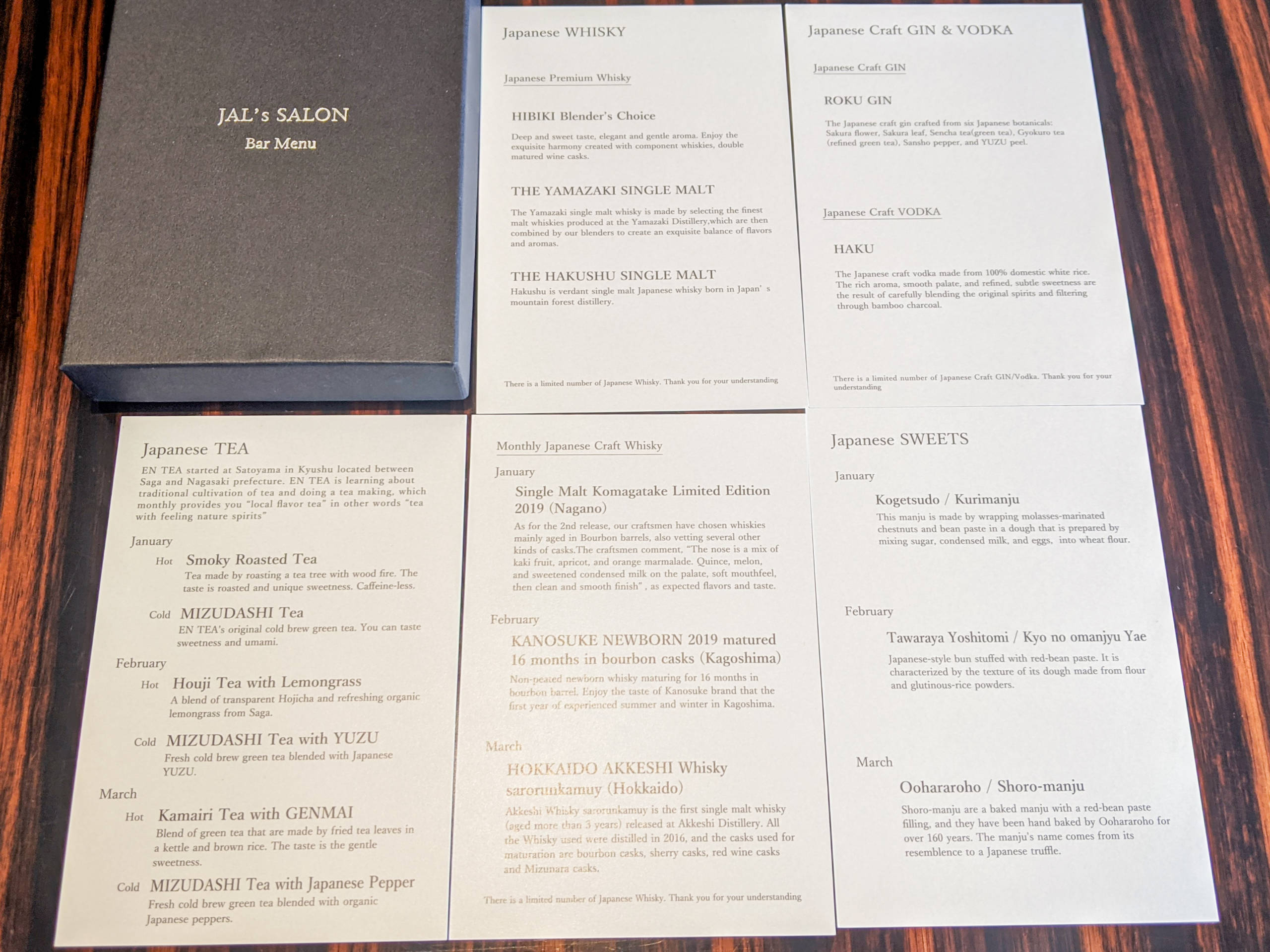 The JAL SALON also features a bartender that will provide Japanese premier whiskey, craft whiskey, craft gin, craft vodka, Japanese tea and Japanese sweets to passengers upon request. There are boxes with menu cards on each table in the JAL SALON.