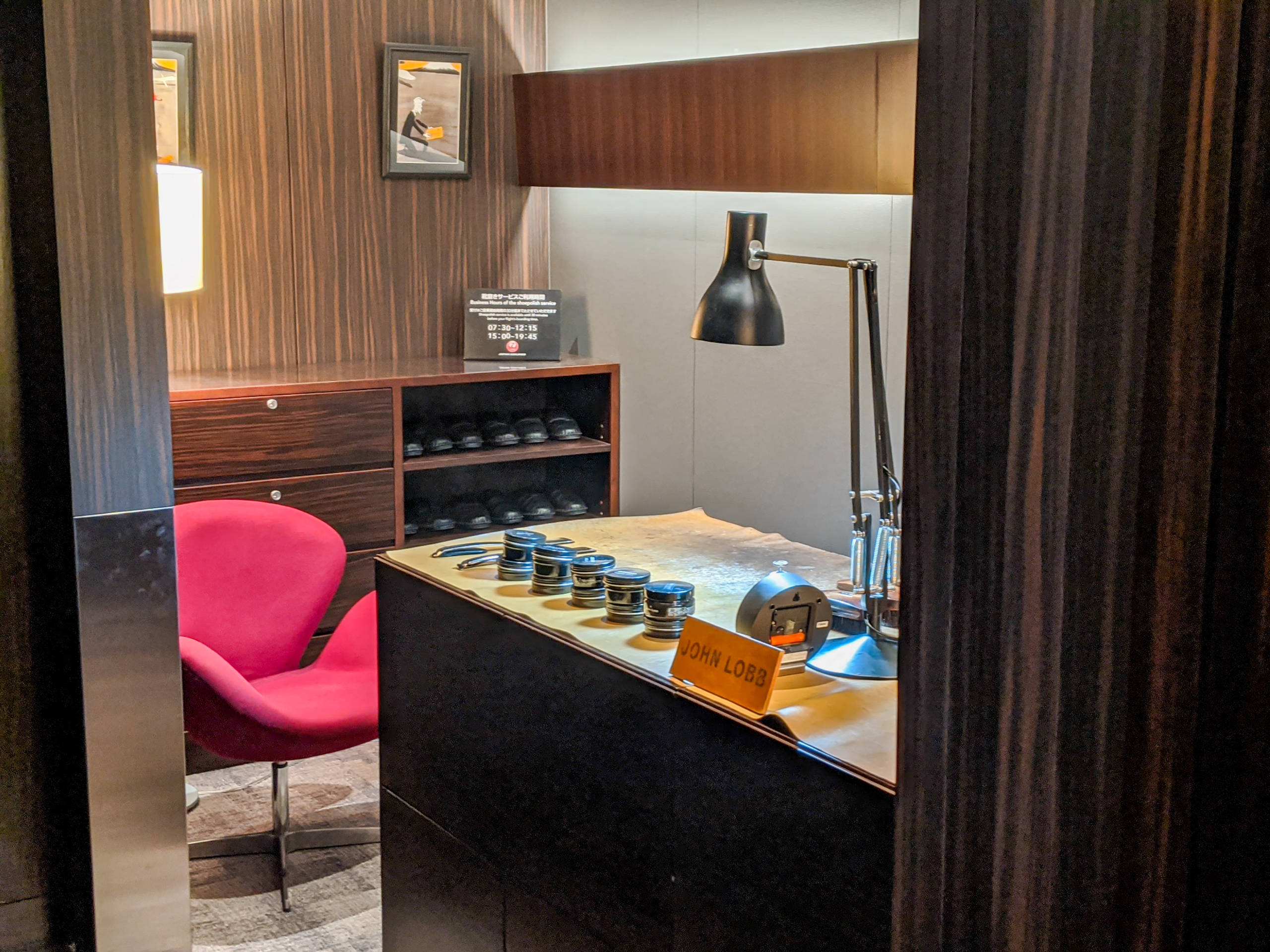 After the bar, you'll see a hall on the left that leads to a staffed shoe polishing desk that's operated in collaboration with British shoemaker John Lobb.
