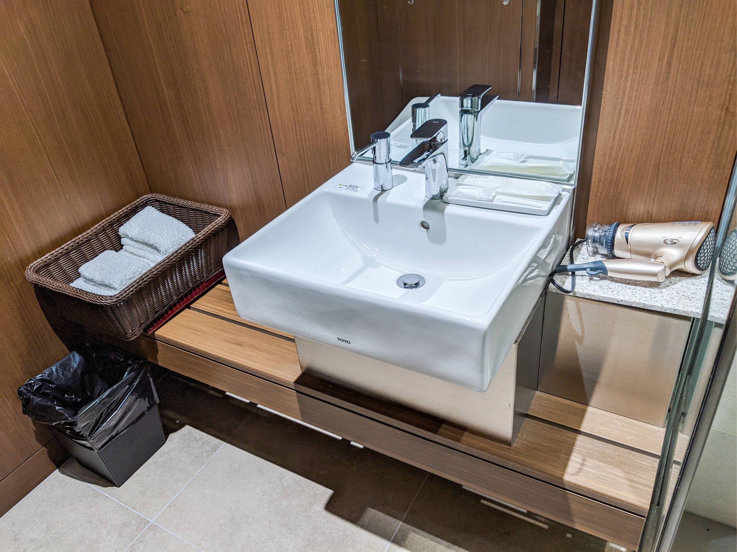 The women's restroom has two individual rooms with Toto toilets, sinks and cotton hand towels. There's also a sink and make-up counter available outside the individual toilet rooms.