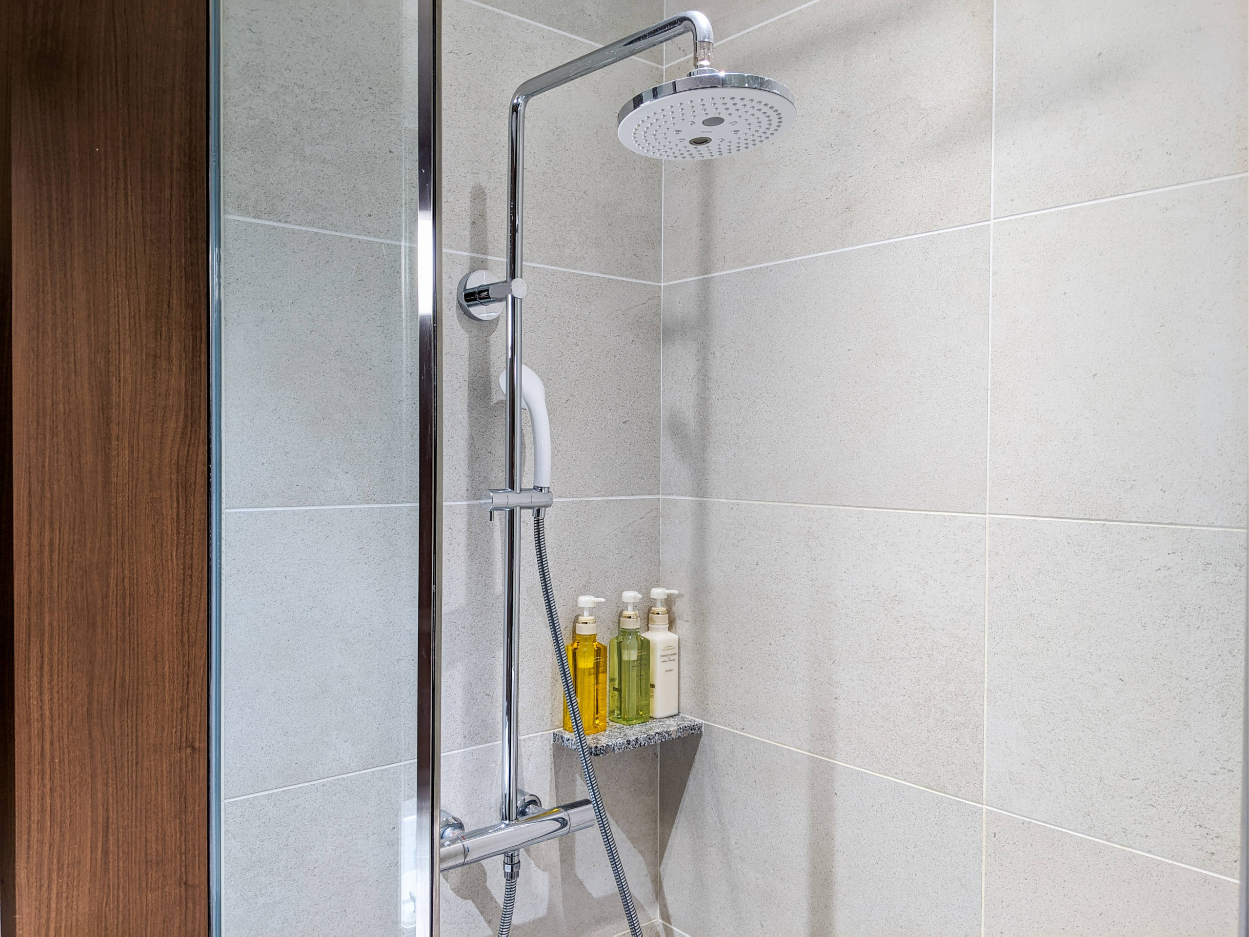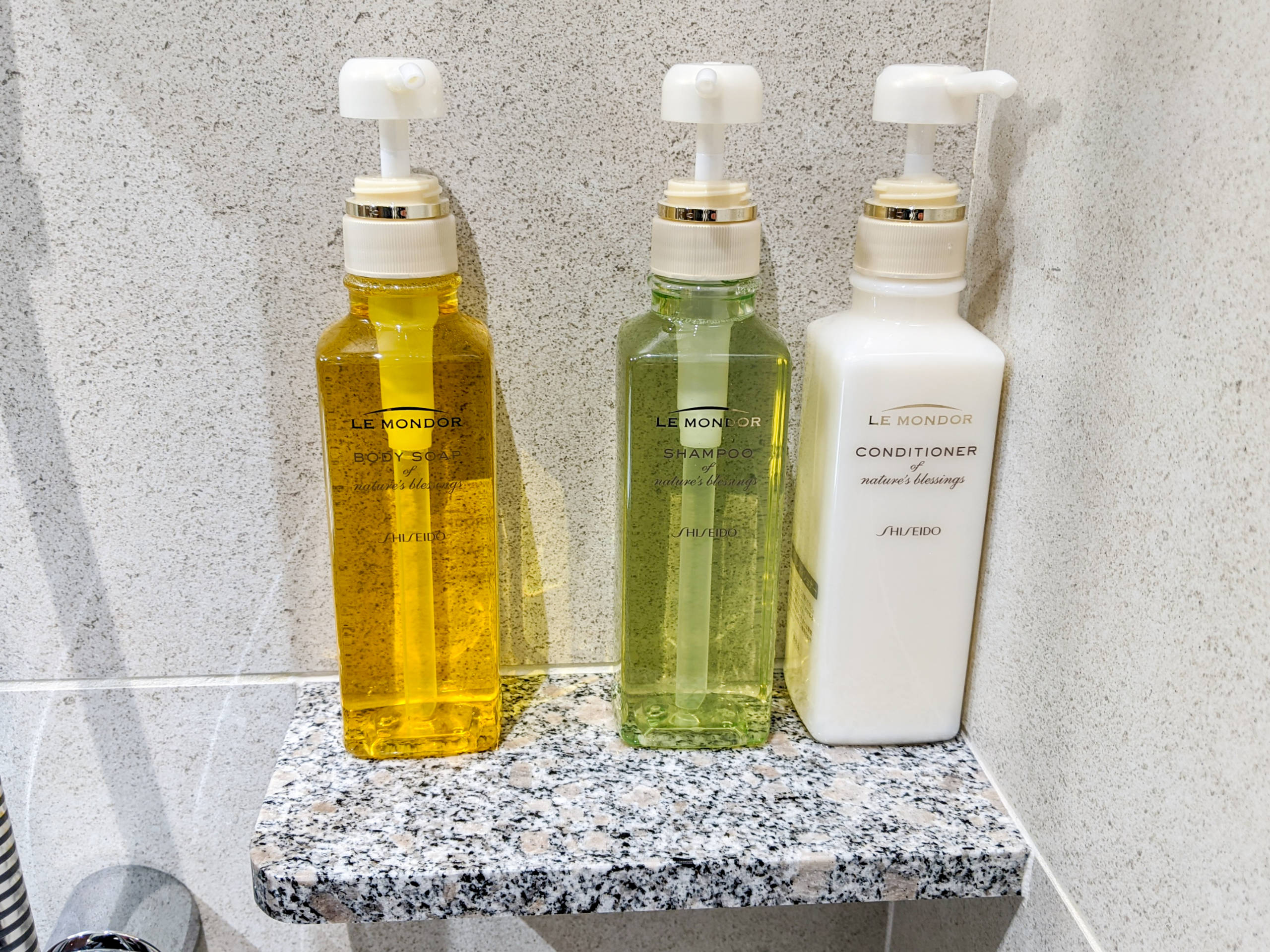 There's shampoo, conditioner and soap in the shower. The floor of the shower is made of anti-slip material, so there's no fear of falling.
