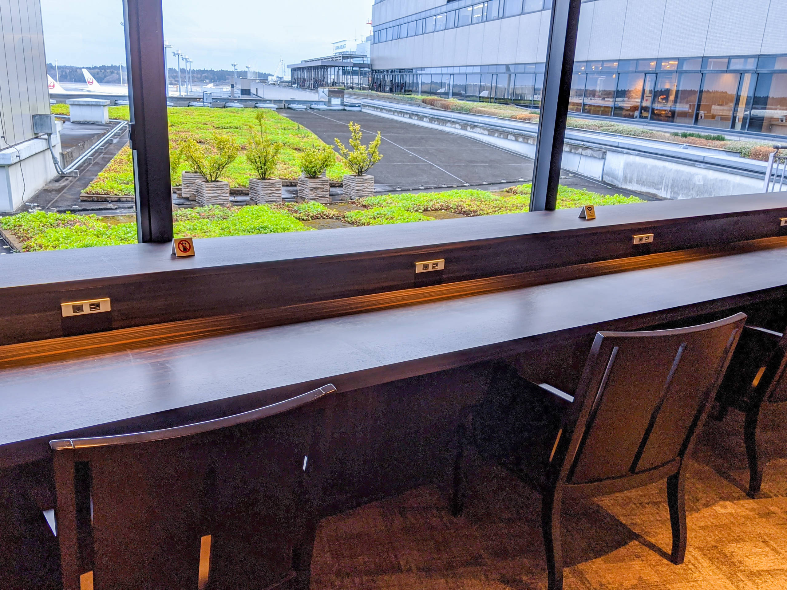 Most, but not all, chairs have access to an outlet that will fit a two-prong ungrounded U.S. plug. This lounge area is relatively dark and doesn't feature the apron views that many AvGeeks loved in the pre-renovation space. Only two tables are next to a window in the JAL SALON.