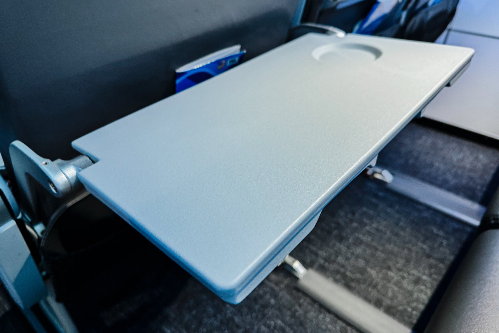 The tray is small but functional. It's set upon adjustable sliders to help accommodate larger electronic items, but it's not ideal if you plan to work throughout the flight as it doesn't offer much working room.
