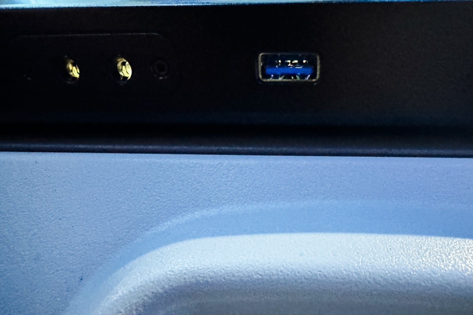 Each seat has a universal power outlet and a USB-C port installed on the underside of the seat in front. You can also find a USB-A port beneath the inflight entertainment screens. By comparison, standard economy seats share two power outlets among three seats via a universal plug and USB-C port, plus USB-A ports in each seatback screen.