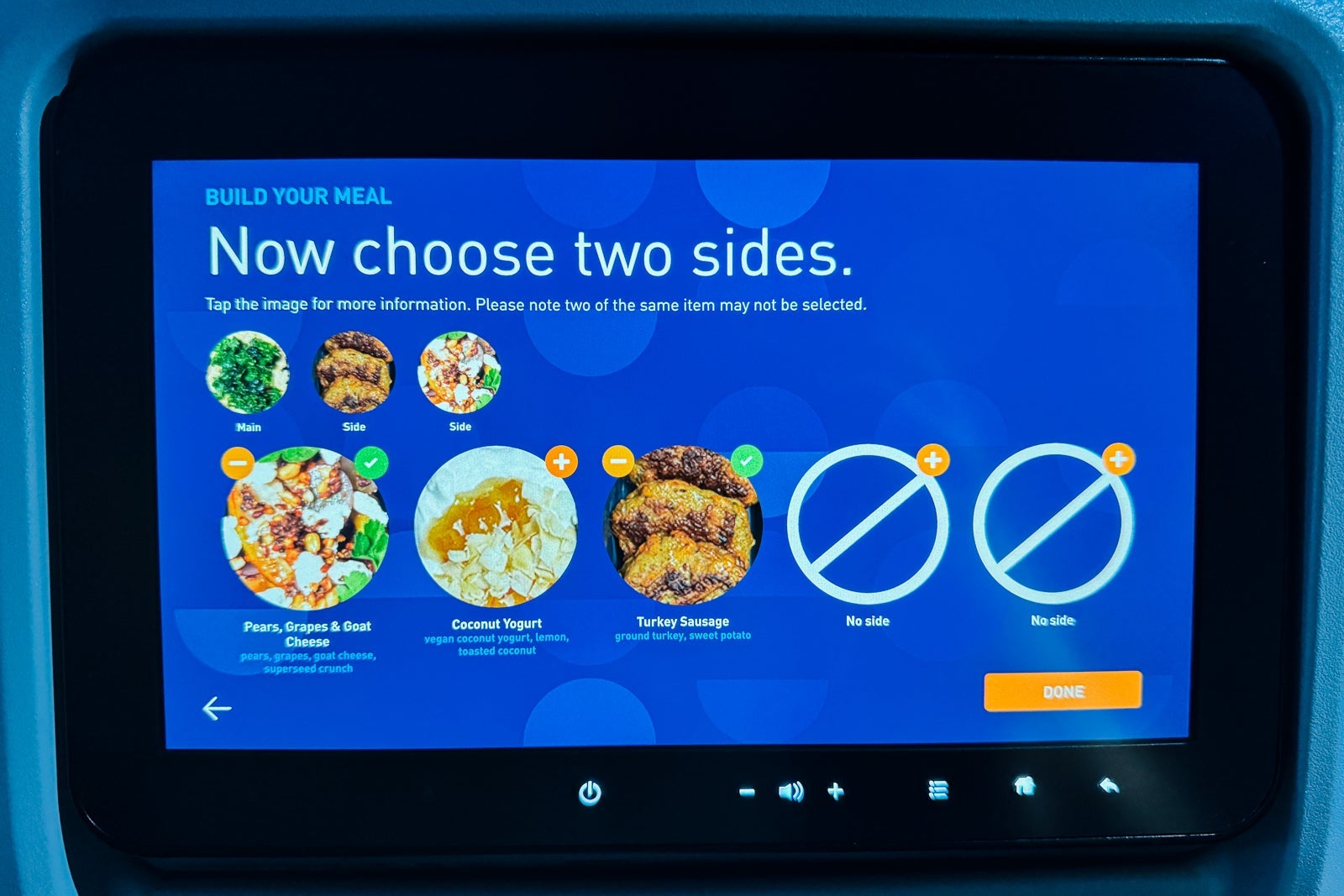 The system lets you choose your own meal through your IFE system, selecting from one of three main dishes and two out of three sides. As this was an early morning flight, I was offered a breakfast menu.