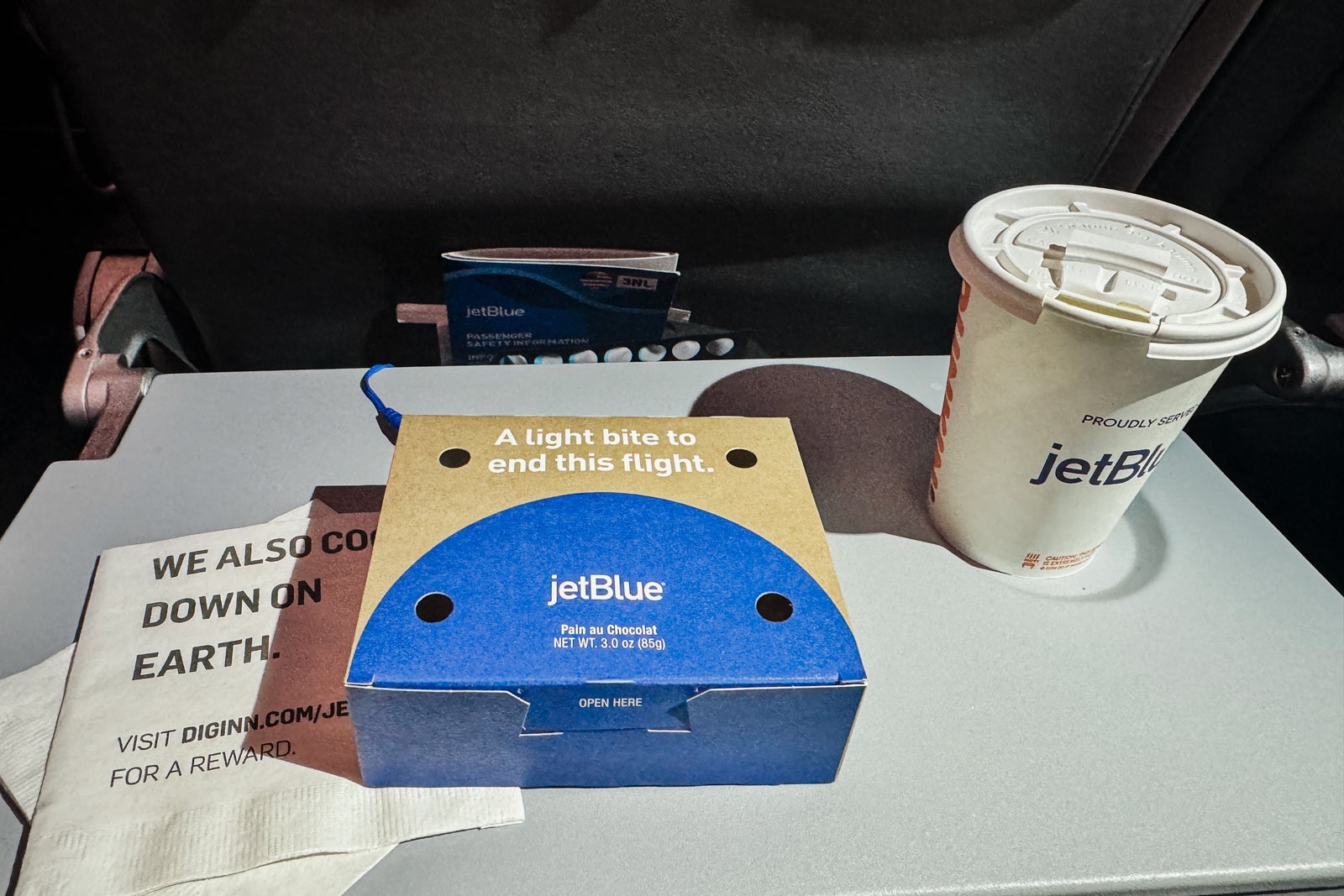 Drinks were complimentary and included a mix of hot (tea and coffee is Dunkin' branded) and cold drinks, of both alcoholic and nonalcoholic varieties. Options included tea, Dunkin'-branded coffee and a selection of beer, wine and liquor from popular brands such as Bud Light, Stella Artois, Jack Daniel's and Tito's Handmade Vodka. Flight attendants offered drinks just after takeoff, before the meal service and again before they served the late snack.