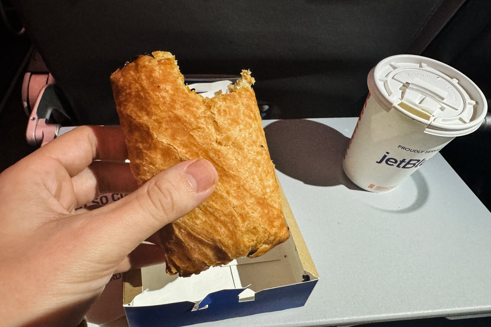 Forty-five minutes before landing, flight attendants offered a warm croissant, which was actually a pain au chocolate and tasted great.