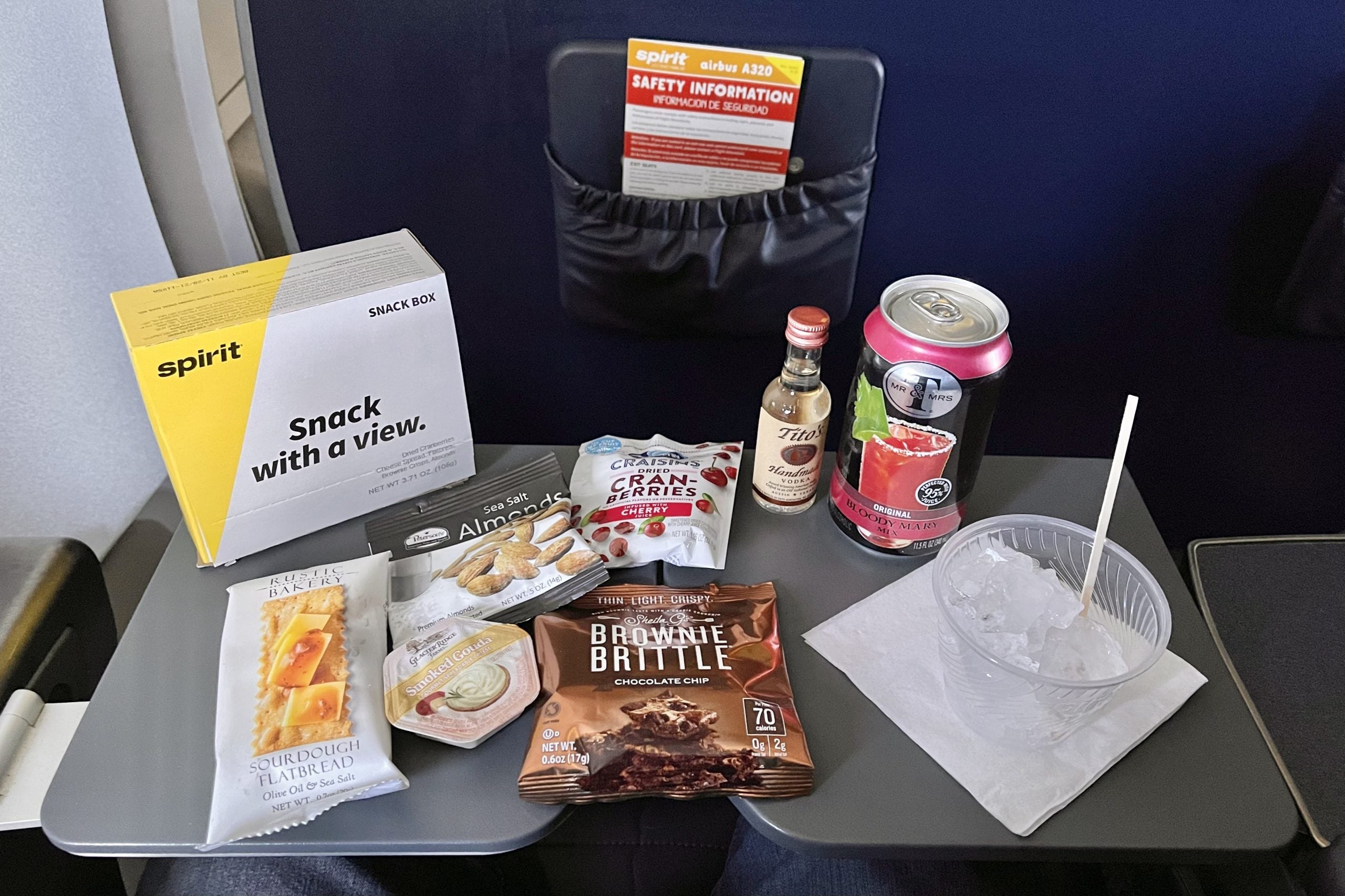 While Spirit's options are very much "economy," I was still quite pleased with my $8 snack box and Bloody Mary. I didn't realize I'd be paying separately for the miniature of vodka ($8) and the Bloody Mary mix ($3), but a-la-carte pricing is the name of the game here. At least the cup of ice and napkin were free!