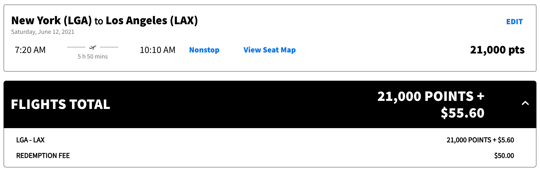 A nonstop award from New York (LGA) to Los Angeles costs 21,000 points on the same date, for example, plus a $50 redemption fee for flights within 28 days that's waived for elites and select credit card holders.