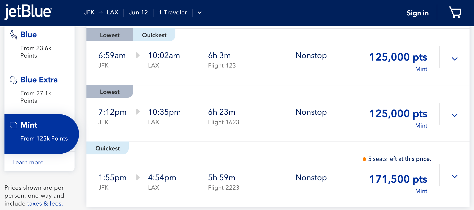 On the redemption front, JetBlue prices Mint awards far higher than coach — you'll get a roughly 1-cent value for each TrueBlue point when booking a premium seat, far below TPG's 1.3-cent valuation. As a result, you can see some pretty astronomical awards — we're talking 125,000 points and up for a one-way flight.