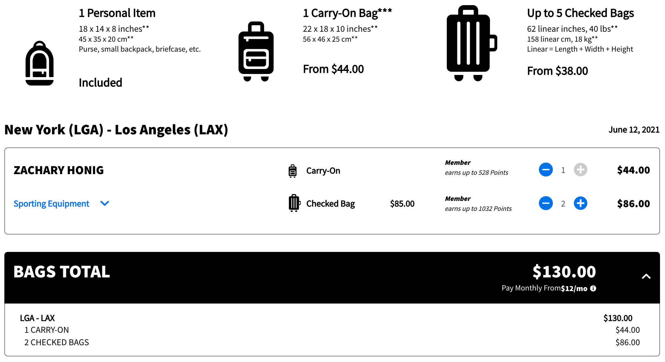 Two checked bags came bundled with my JetBlue Mint fare — had I checked the same amount on Spirit, I would have been looking at an additional $130, just for a one-way flight.