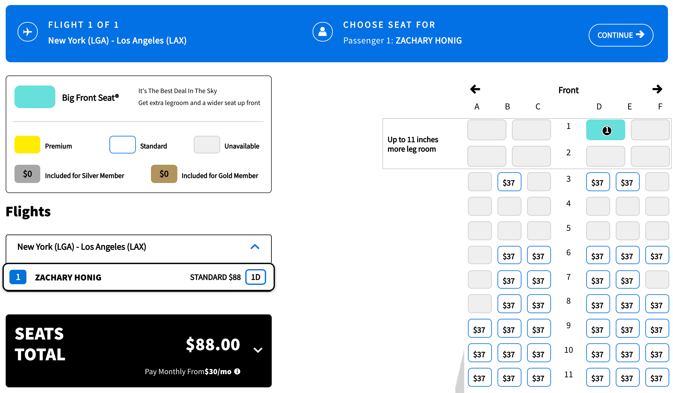 On nonstop flights between New York and the West Coast, I encountered an $88 fee to assign a Big Front Seat, though other routes cost considerably less. On my LAX-ATL flight, for example, Big Front Seats were available for 60 bucks, or a roughly $40 buy-up from Spirit's other seats.