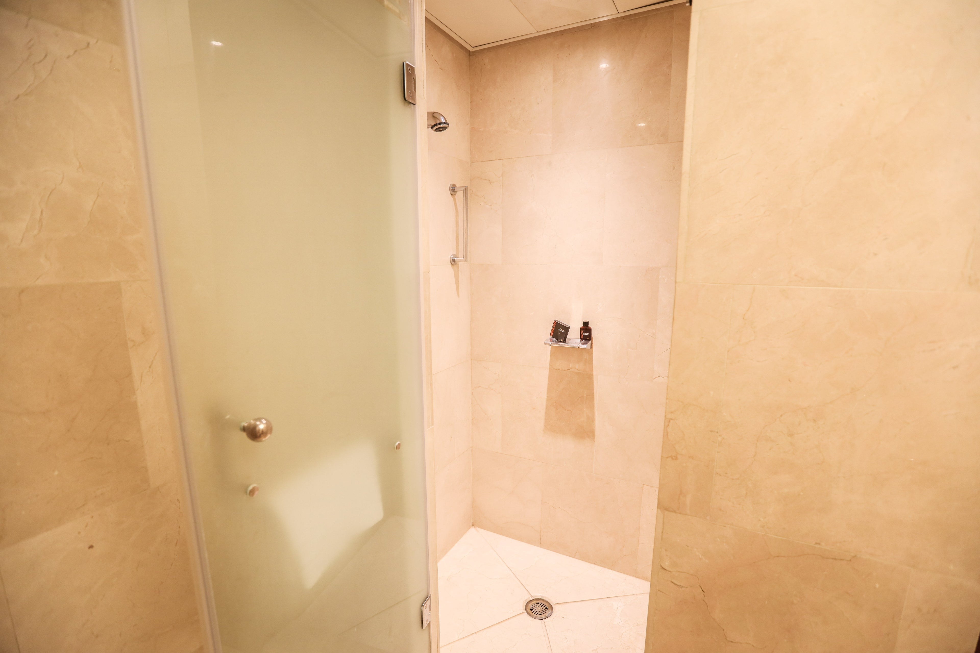 The shower was quite short. While it was fine for me, with solid water pressure, it definitely wouldn't pass the TPG shower test.