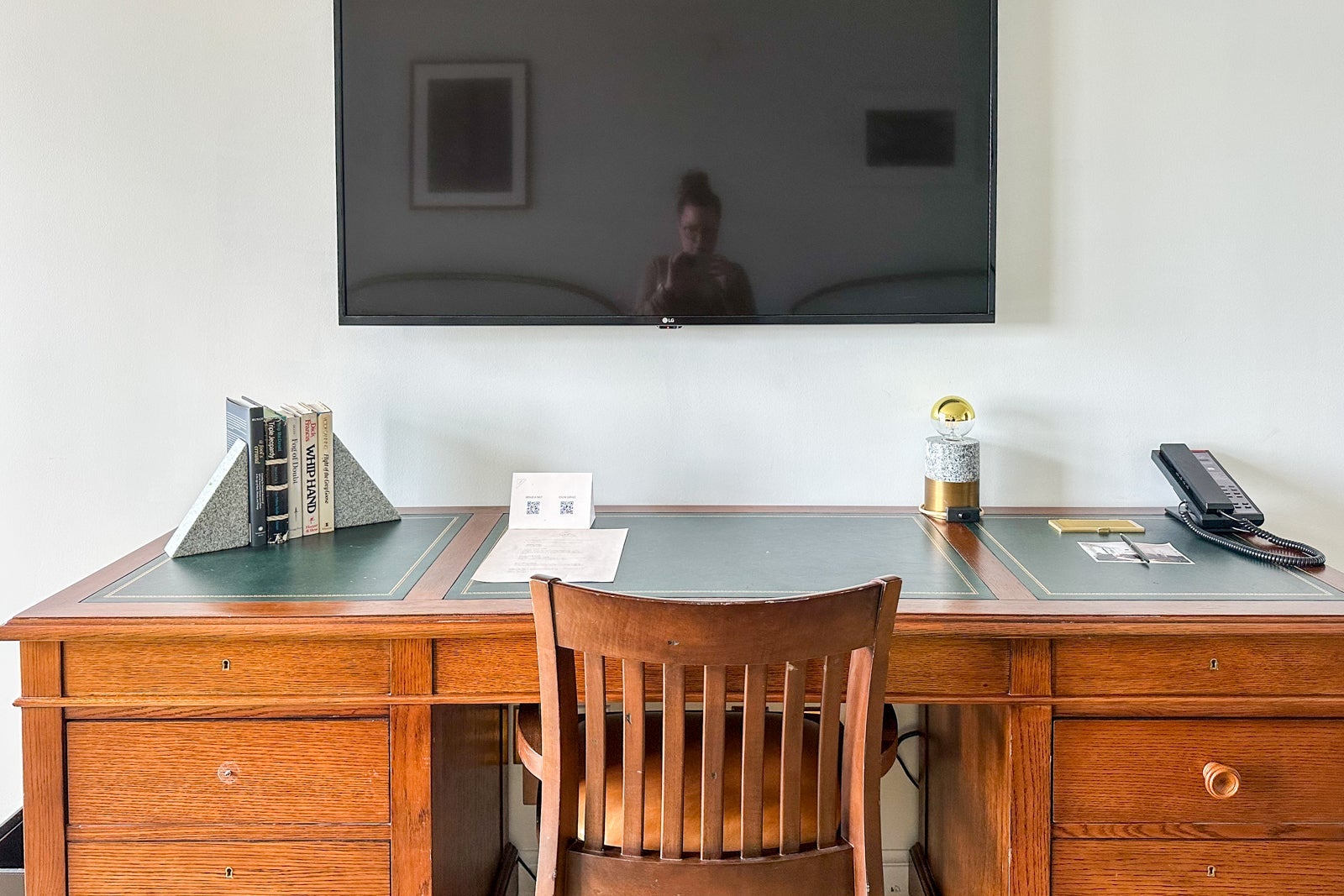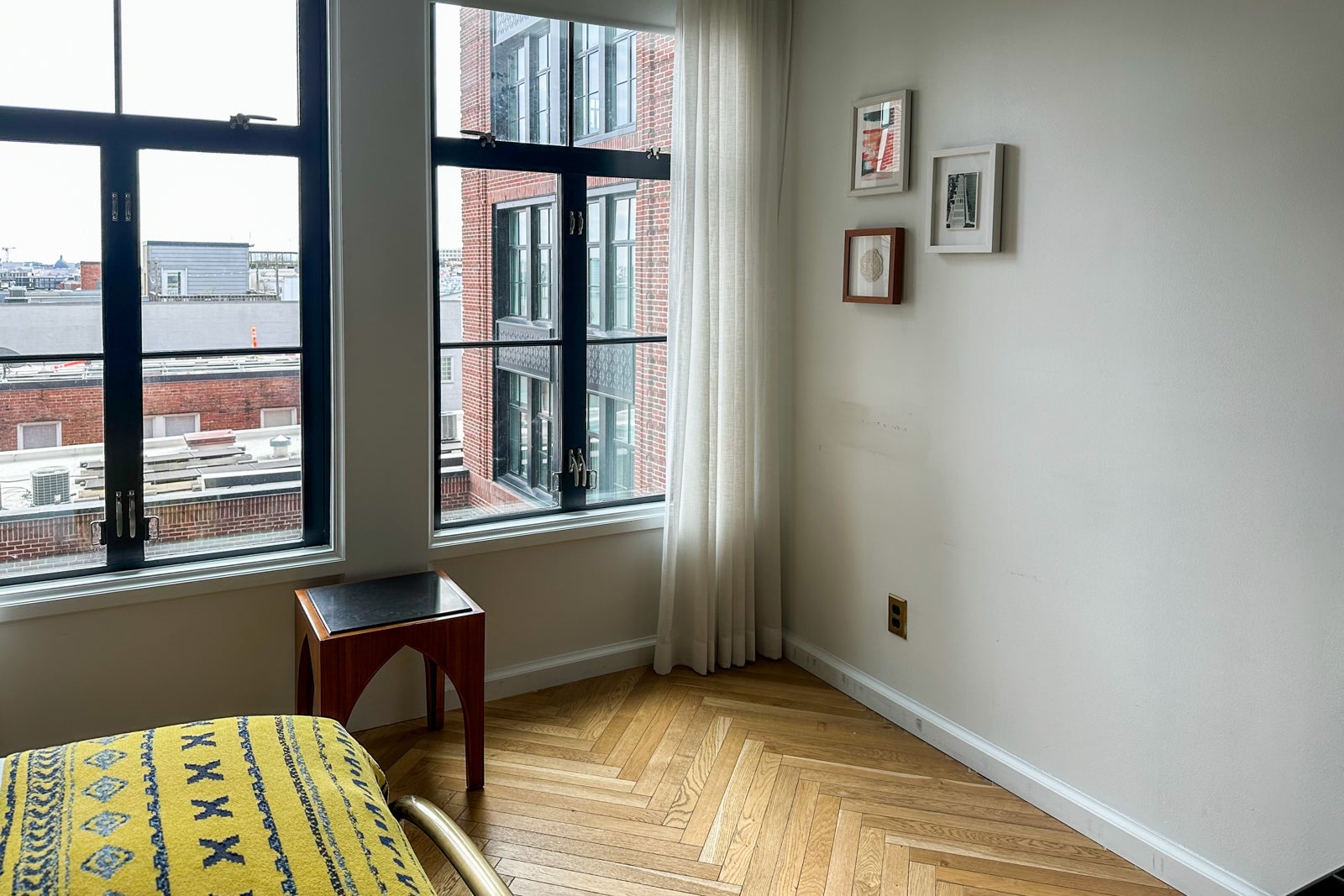 The guest rooms at The Line DC are bright and airy, with large windows and white walls that provide a fresh contrast to brass headboards, artfully exposed wiring and midcentury parquet floors. Even the giant banker-style oak desk manages to feel down to earth with its casually arranged stack of old books, cleverly hidden outlets beneath a hinged metal cover and an old-school pen and postcard for keeping in touch with friends back home.
