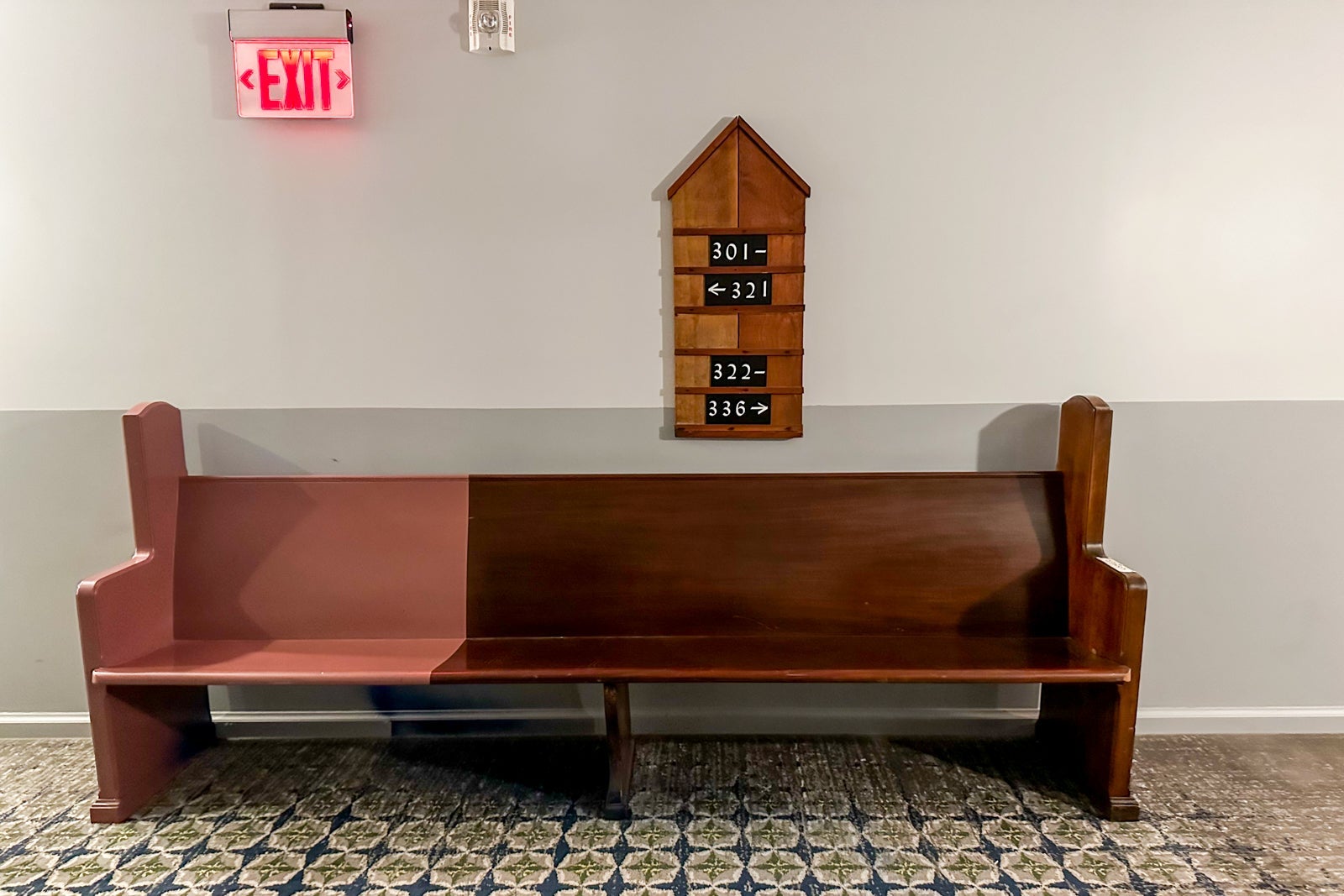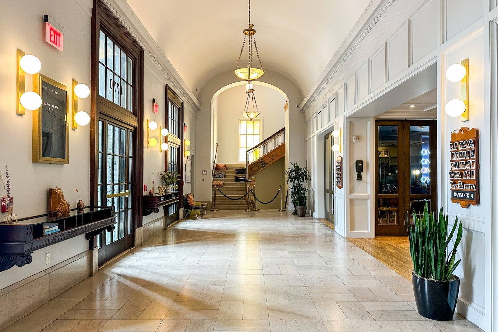 But as you walk into the lobby, you'll feel warmth and style seep from every corner, too. The original organ pipes have been repurposed into the geometric chandelier hanging from the vaulted ceiling and religious recitations have been replaced with the raucous laughter of friends enjoying cocktails by the bar.