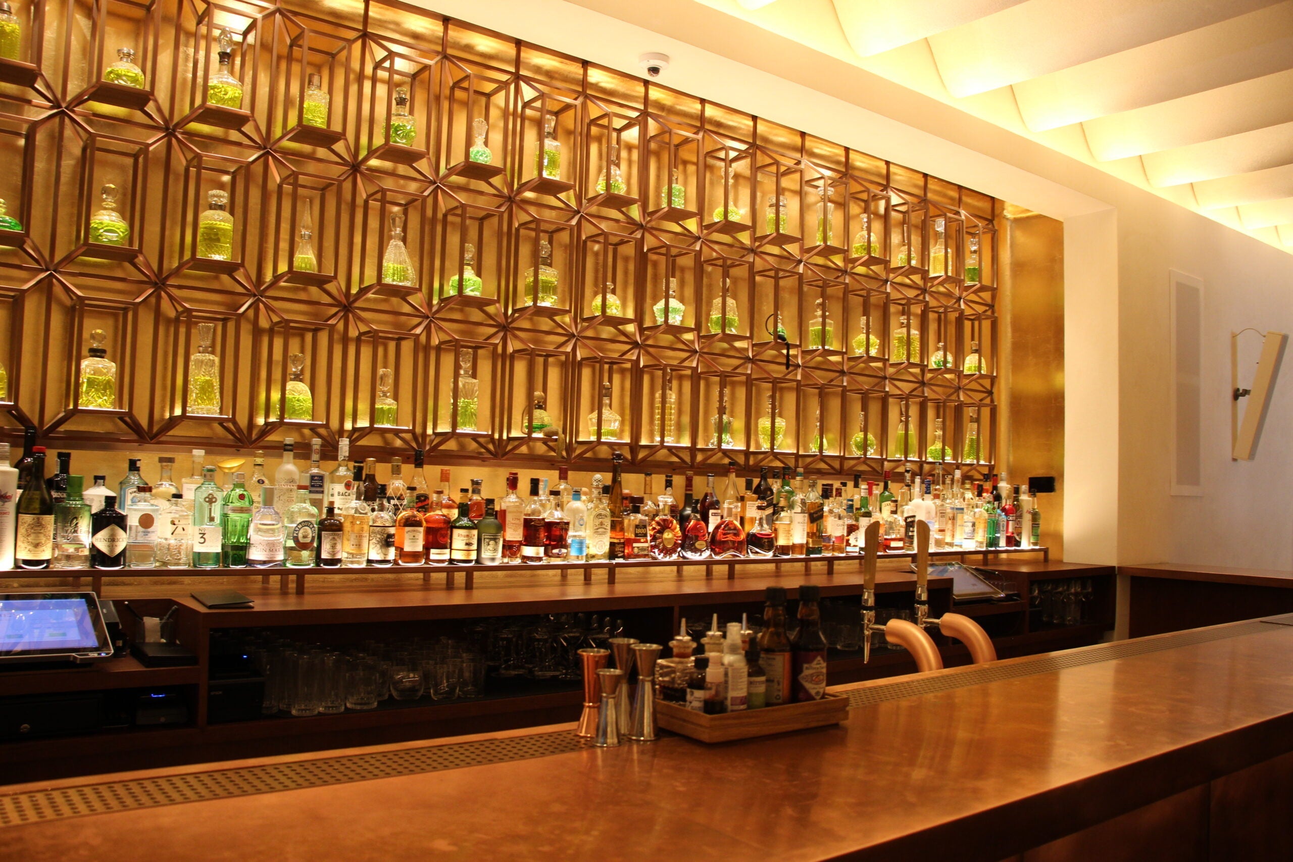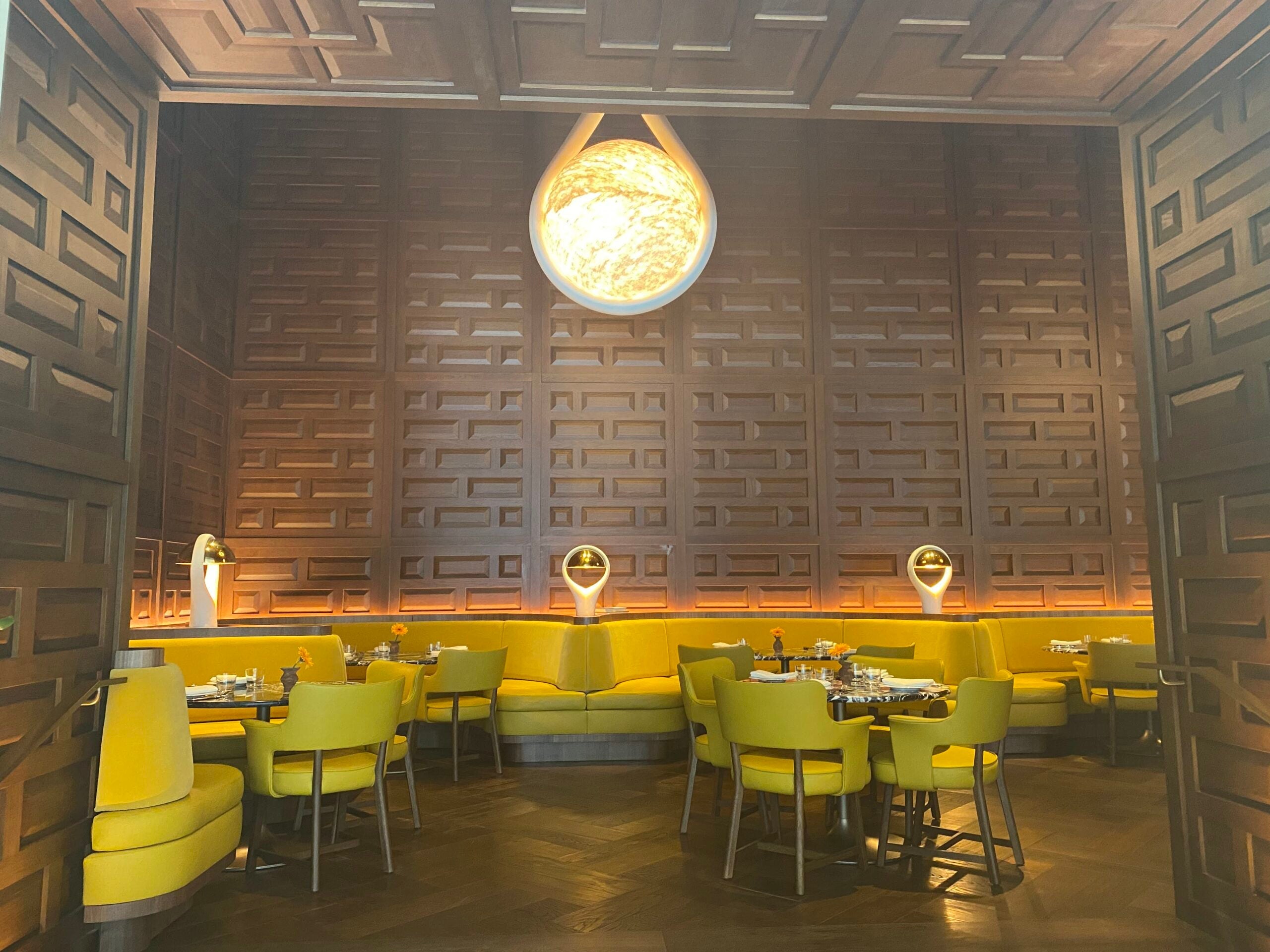 There's also a unique room set off to the left of the entrance with two eye-catching alabaster and plaster hanging lamps that resemble moons or other celestial bodies. Similar to the hotel's iconic staircase, these lamps, created by designer Emmanuel Level Stenne, are the "wow" pieces of the restaurant.