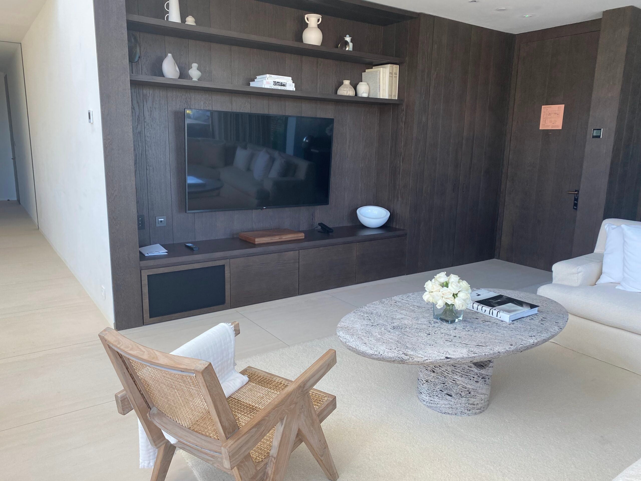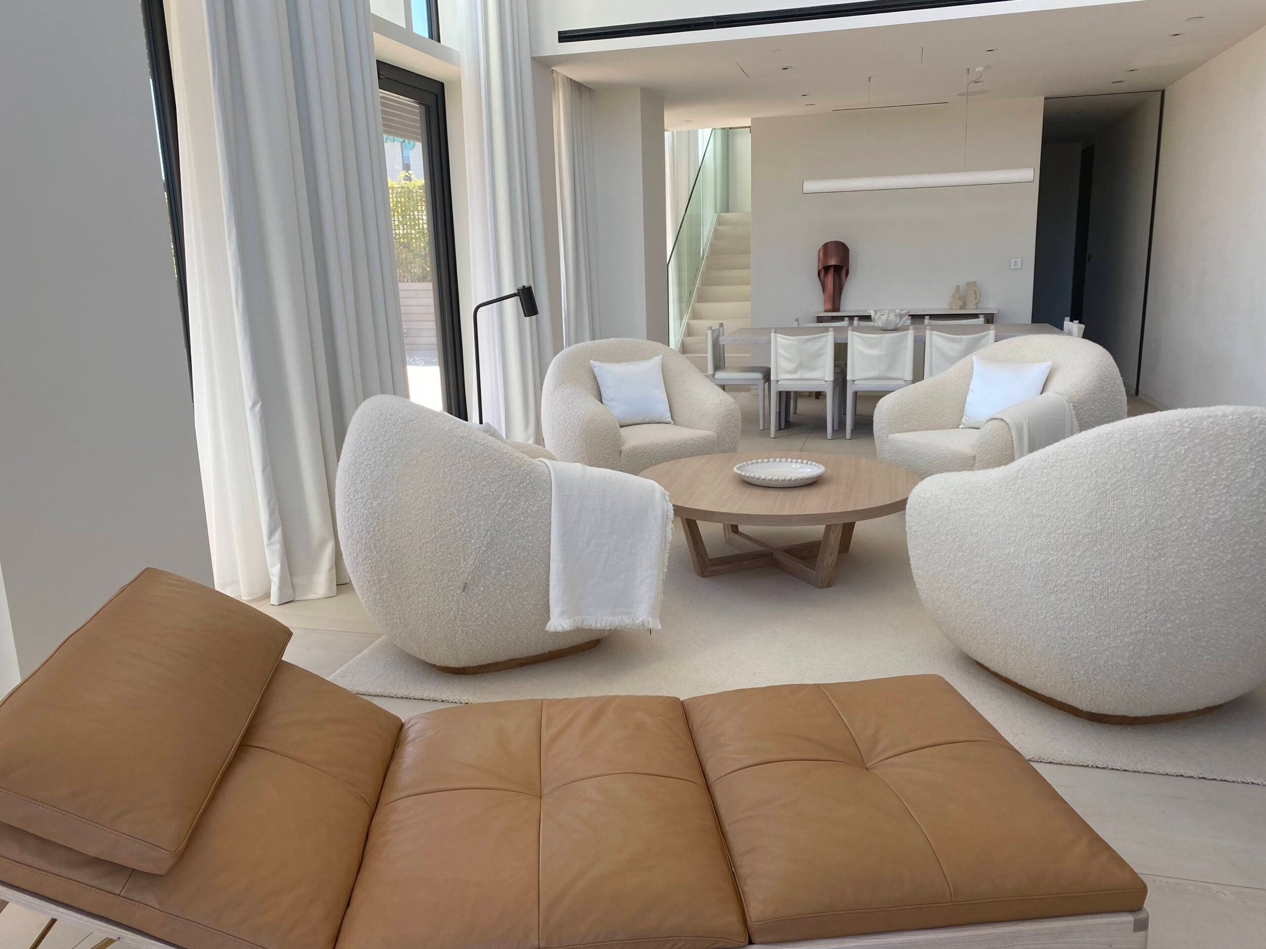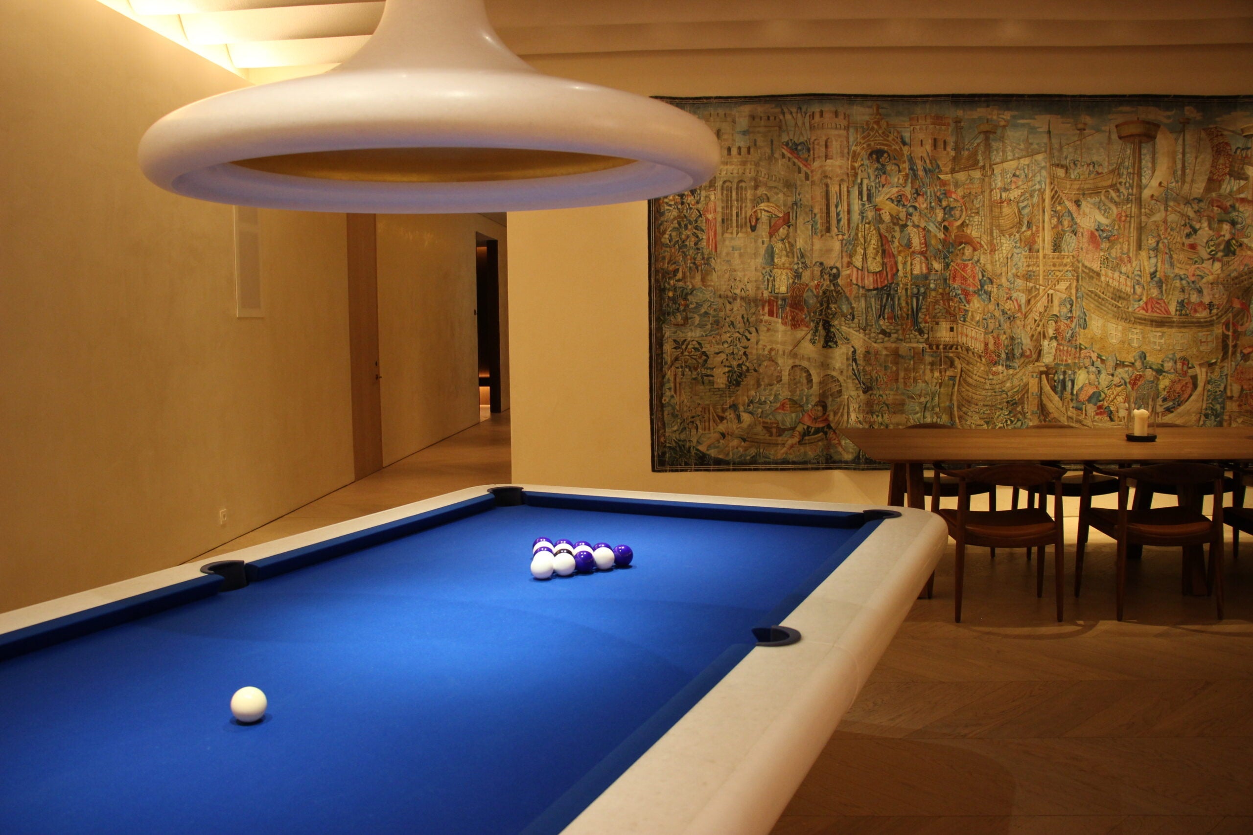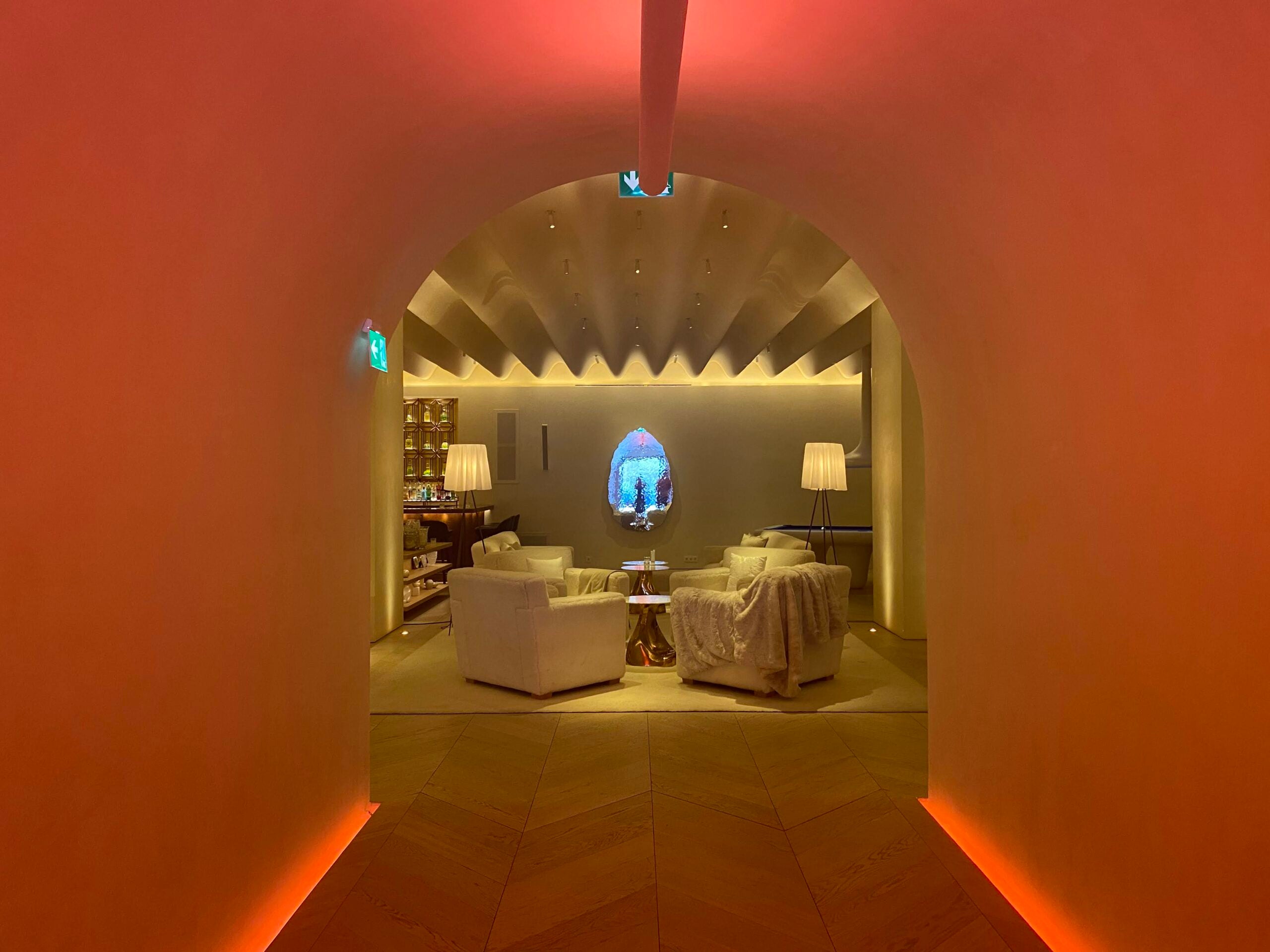 The staircase opens up to a spacious lobby, where chic locals and guests can enjoy cocktails set to DJ beats once the sun sets, or play a game of billiards on the pool table, sculpted from a giant slab of white Bianco Neve matte marble. The refined, backlit bar is inviting, serving up signature cocktails, wine and other drinks.