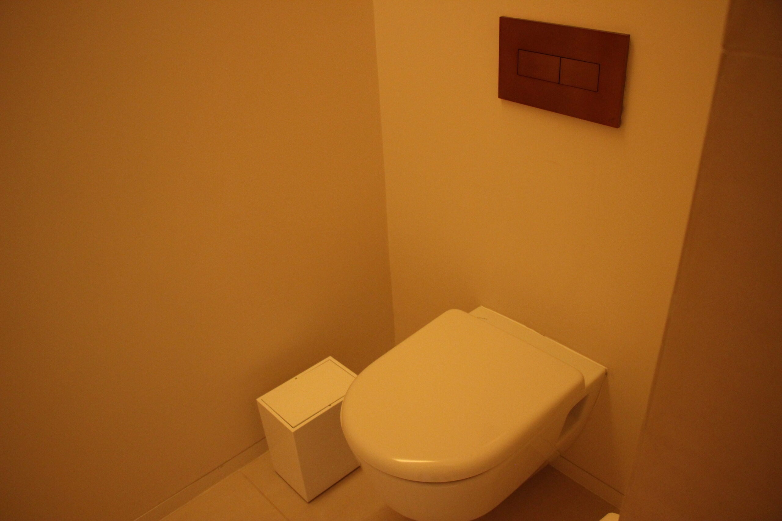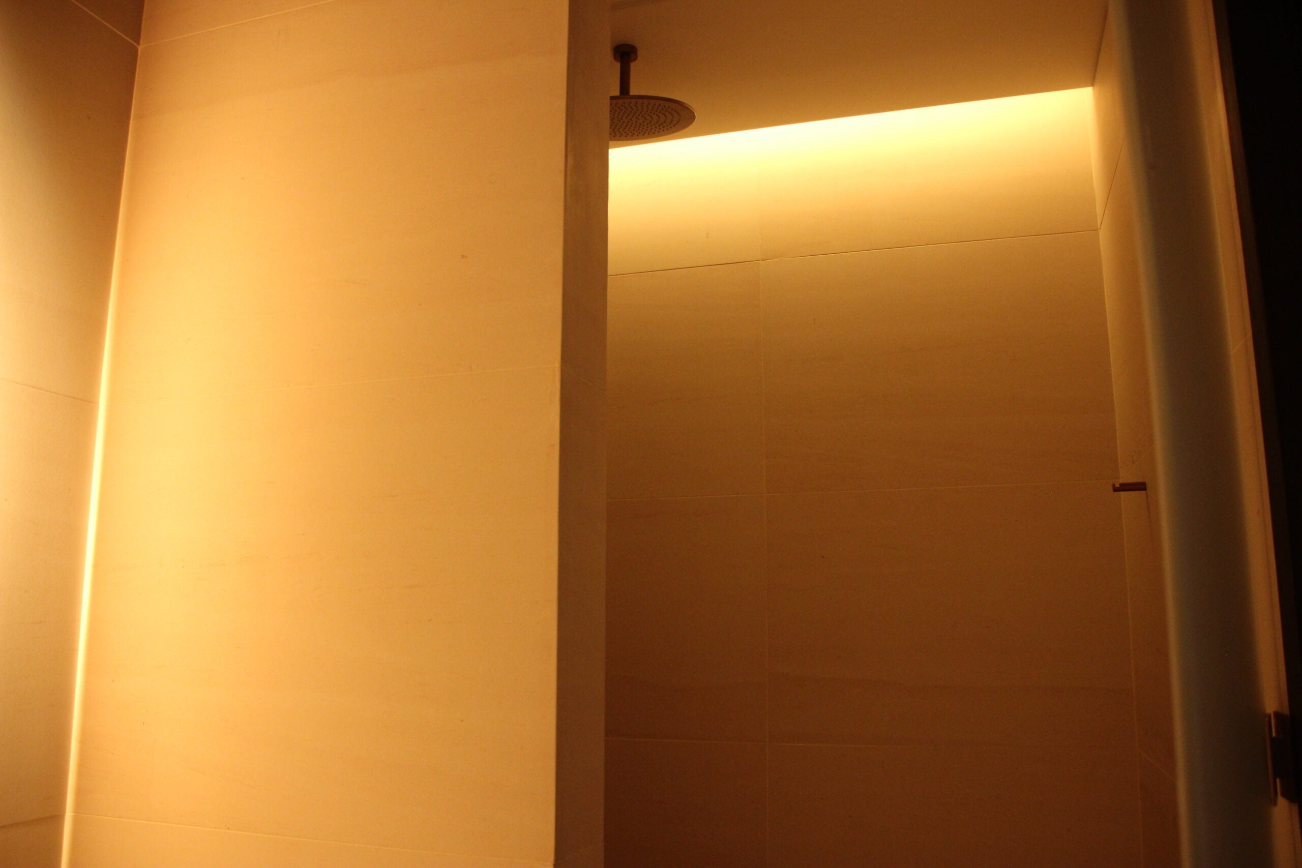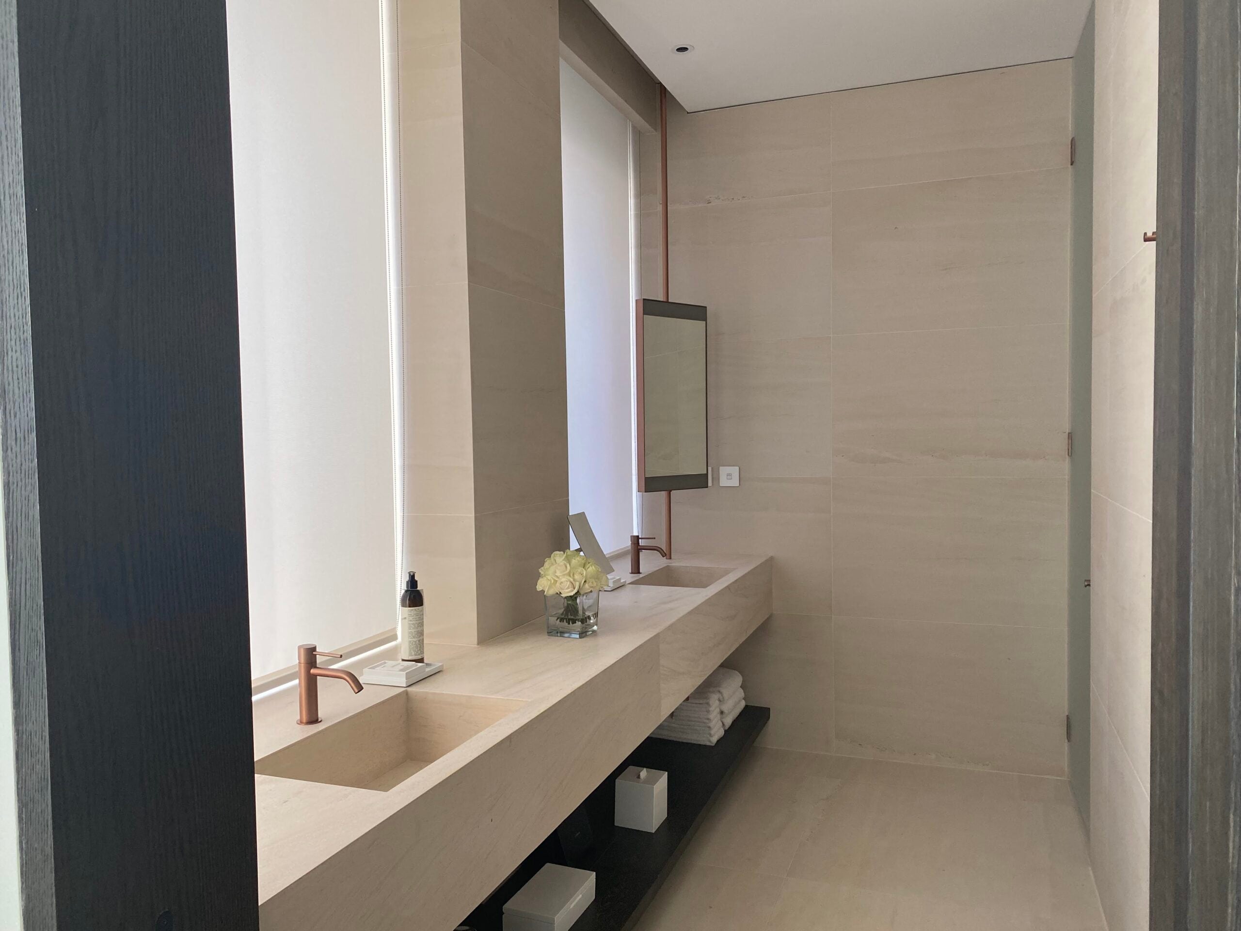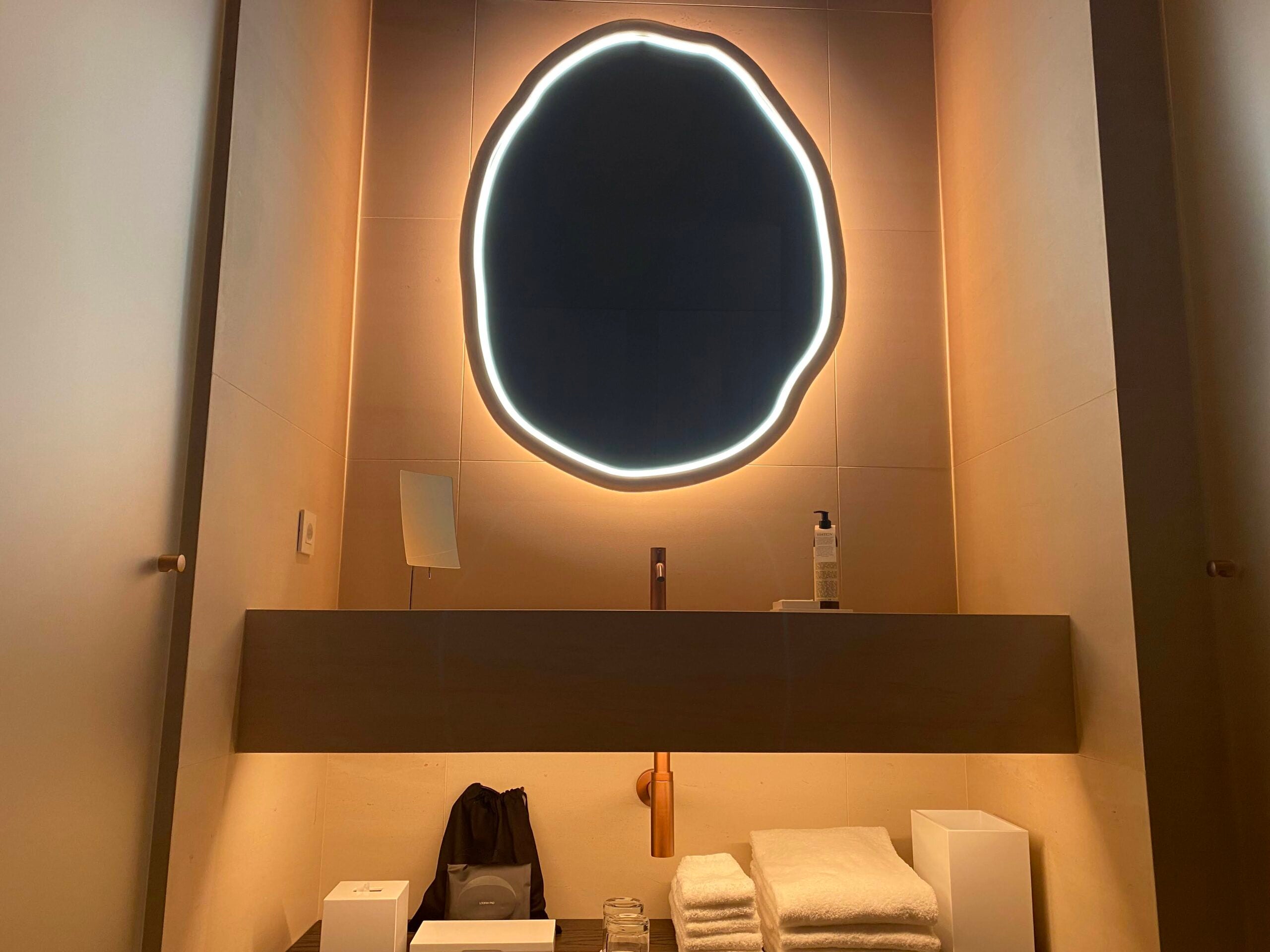 An L-shaped sofa, along with a table and chairs, sat in front of two large windows that gave a luminous feel to the all-white room when the sunshine streamed in. The light contrasted perfectly with the dark, wood-paneled walls of the entrance and the bathroom, which had a single, large vanity with mirror and separate rooms for a toilet and rainfall shower. The room featured high ceilings and the shower did too, complete with excellent pressure. The bathroom lacked natural light, though the mirror had a special ring light for guests wanting extra illumination for applying makeup.