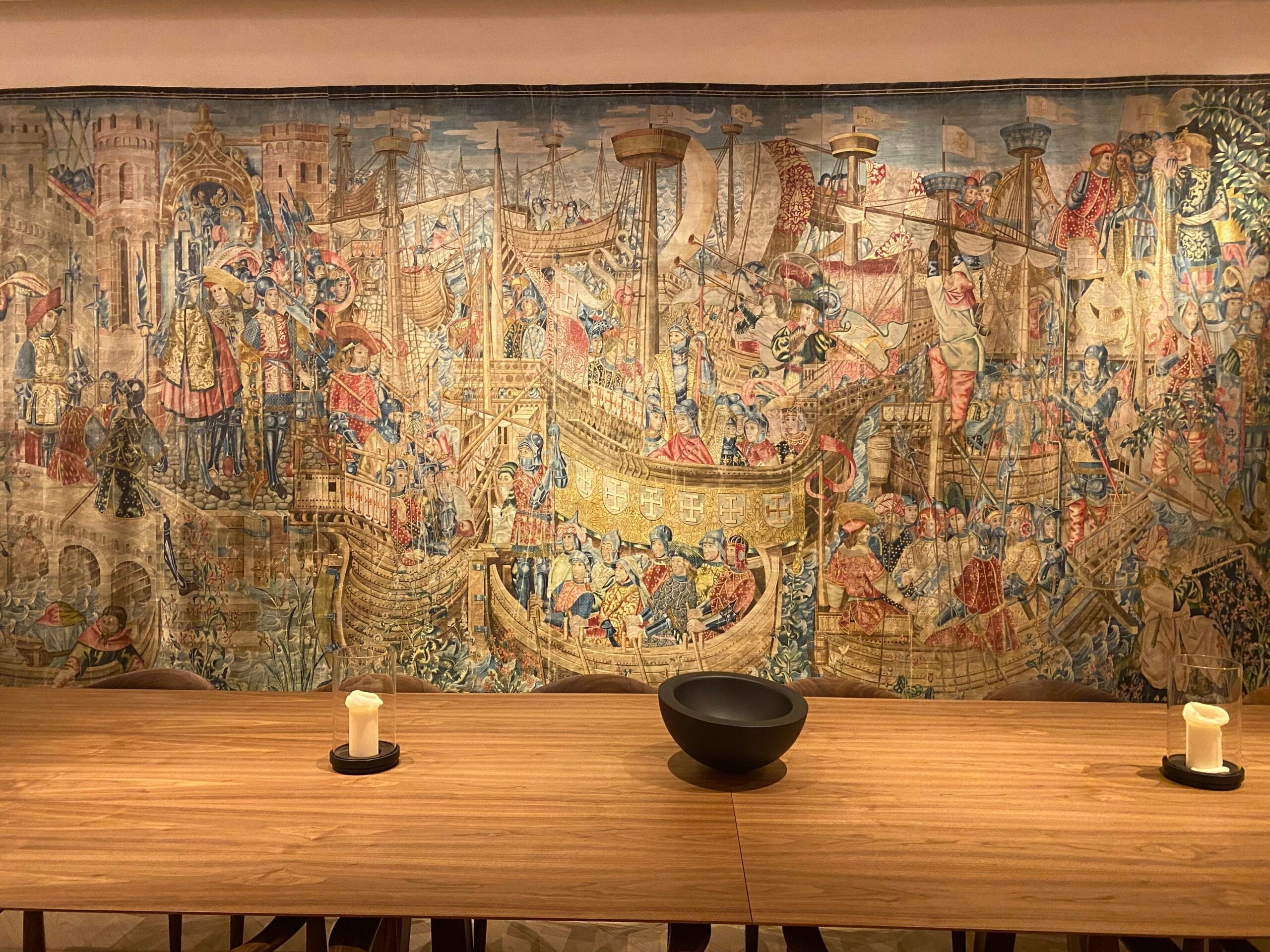 Likewise, a faded but still colorful tapestry from Madrid's Royal Tapestry Factory presides over the sleek lobby furnishings. Hand-woven flamenco shawls are tossed casually over the lobby's Jean-Michel Frank sofas and armchairs are draped with signature Edition faux fur throws.