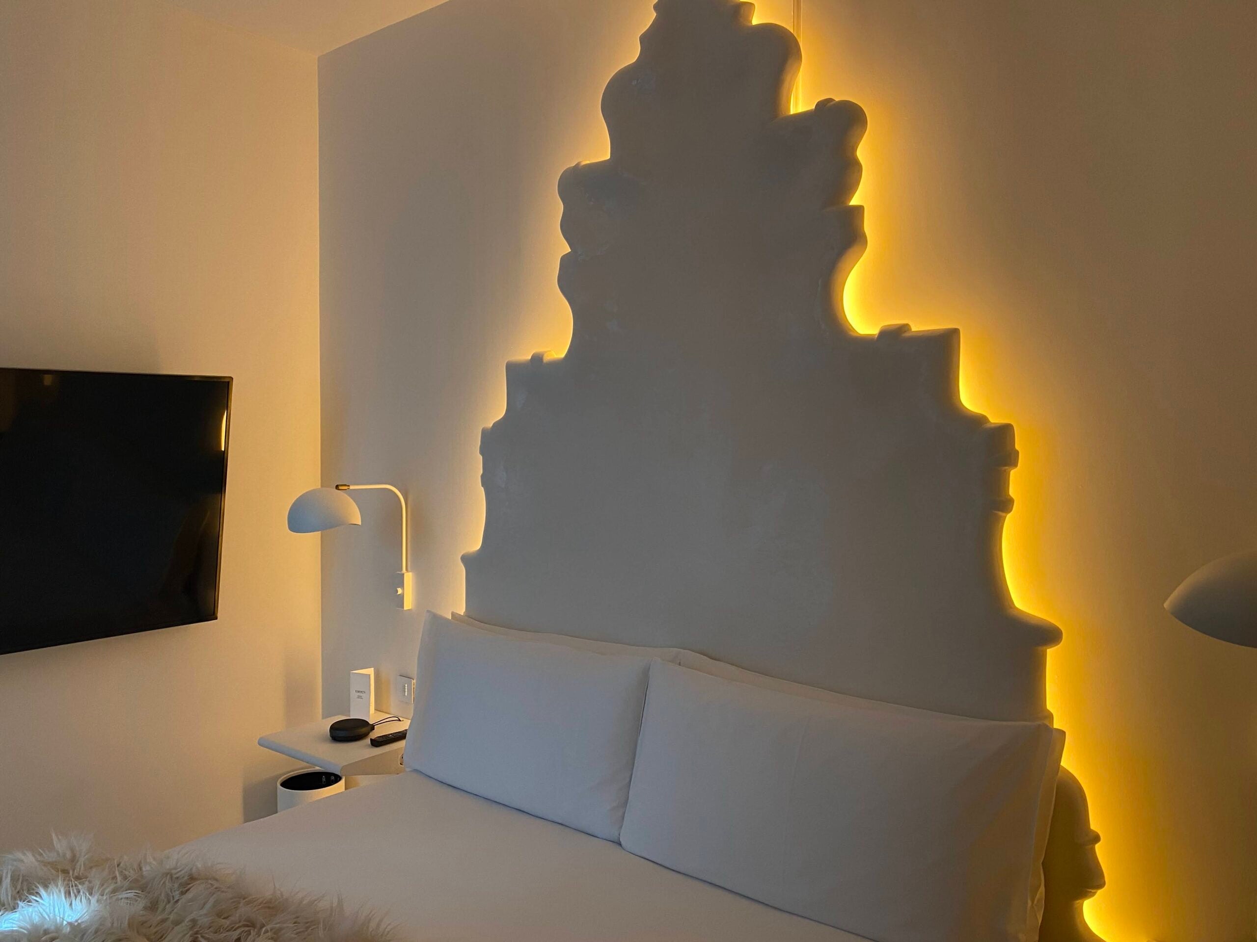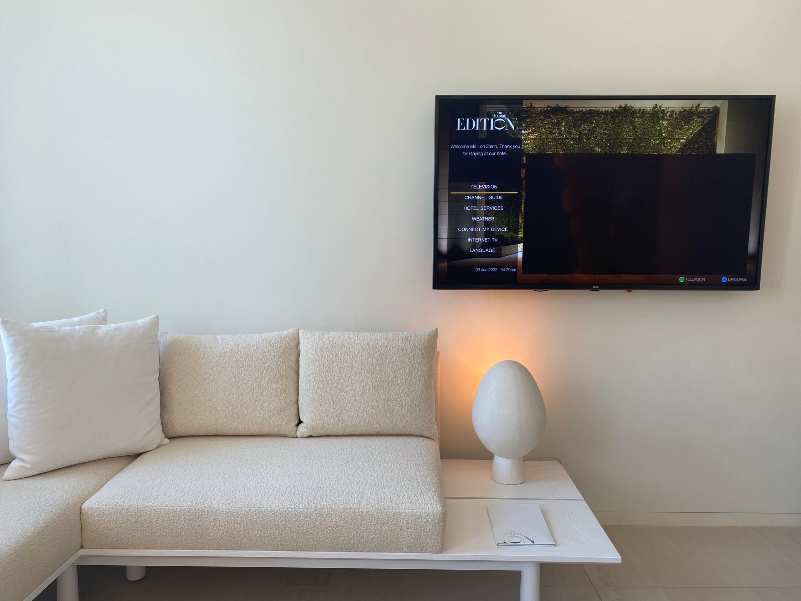 A step up from the lowest room category (superior), the room featured a king bed backed with a signature headboard. The headboard's unique shape is a nod to the aforementioned 18th-century Baroque door — these headboards are present on the beds in each of the 200 guestrooms, which include 21 suites and two penthouses. Of course, the hallmark faux fur throw was carefully arranged on the bed, too, a reminder that the Edition's very specific design aesthetic is a reliable constant no matter where you are in the world.