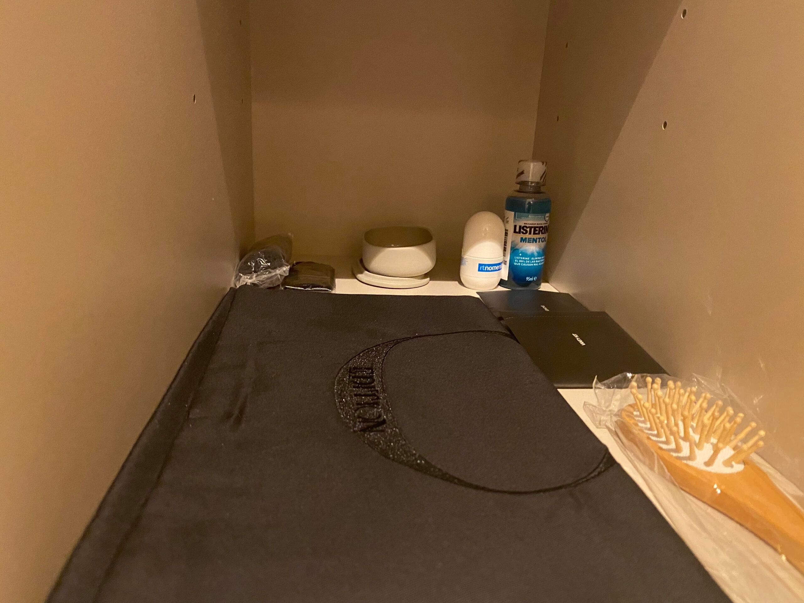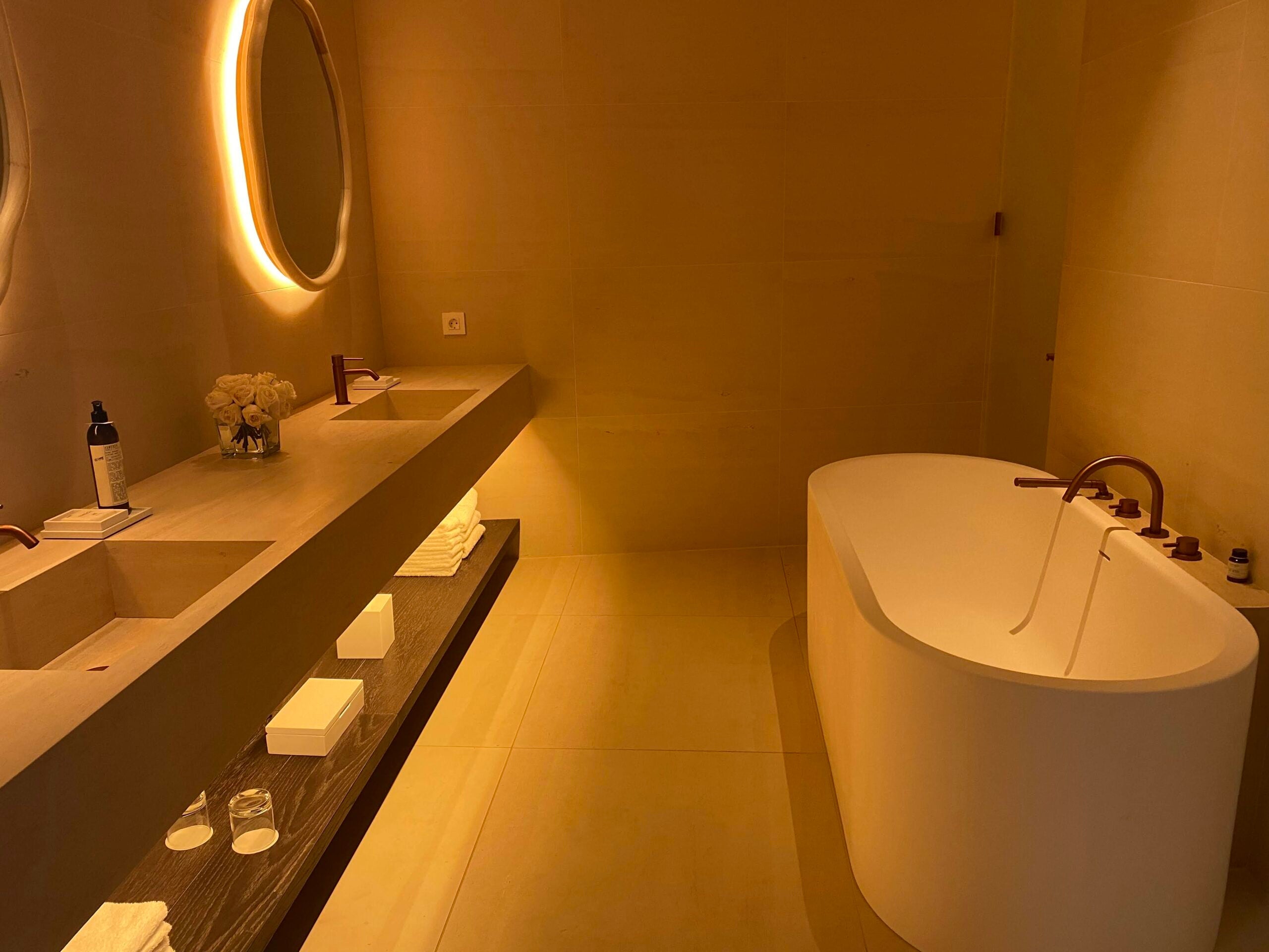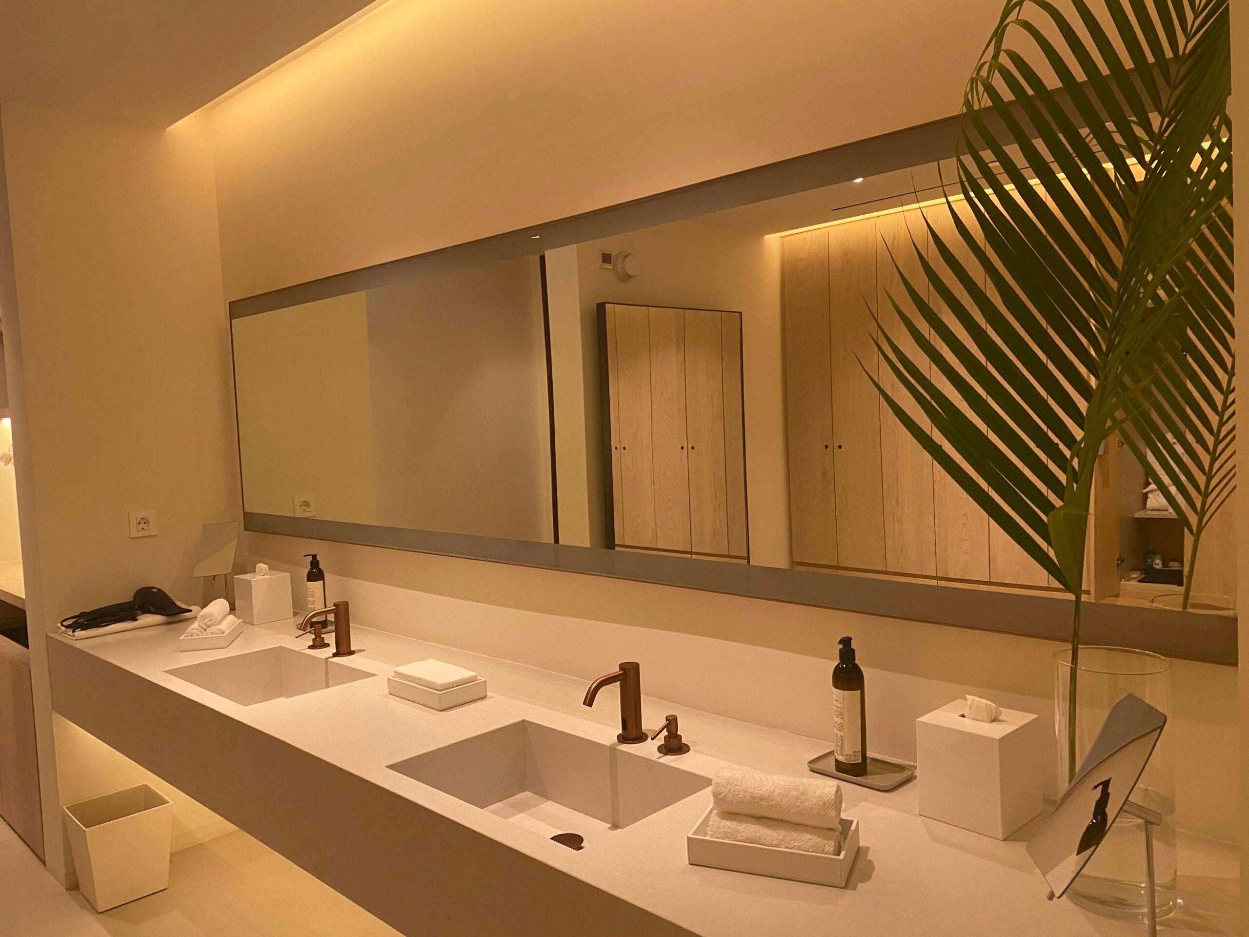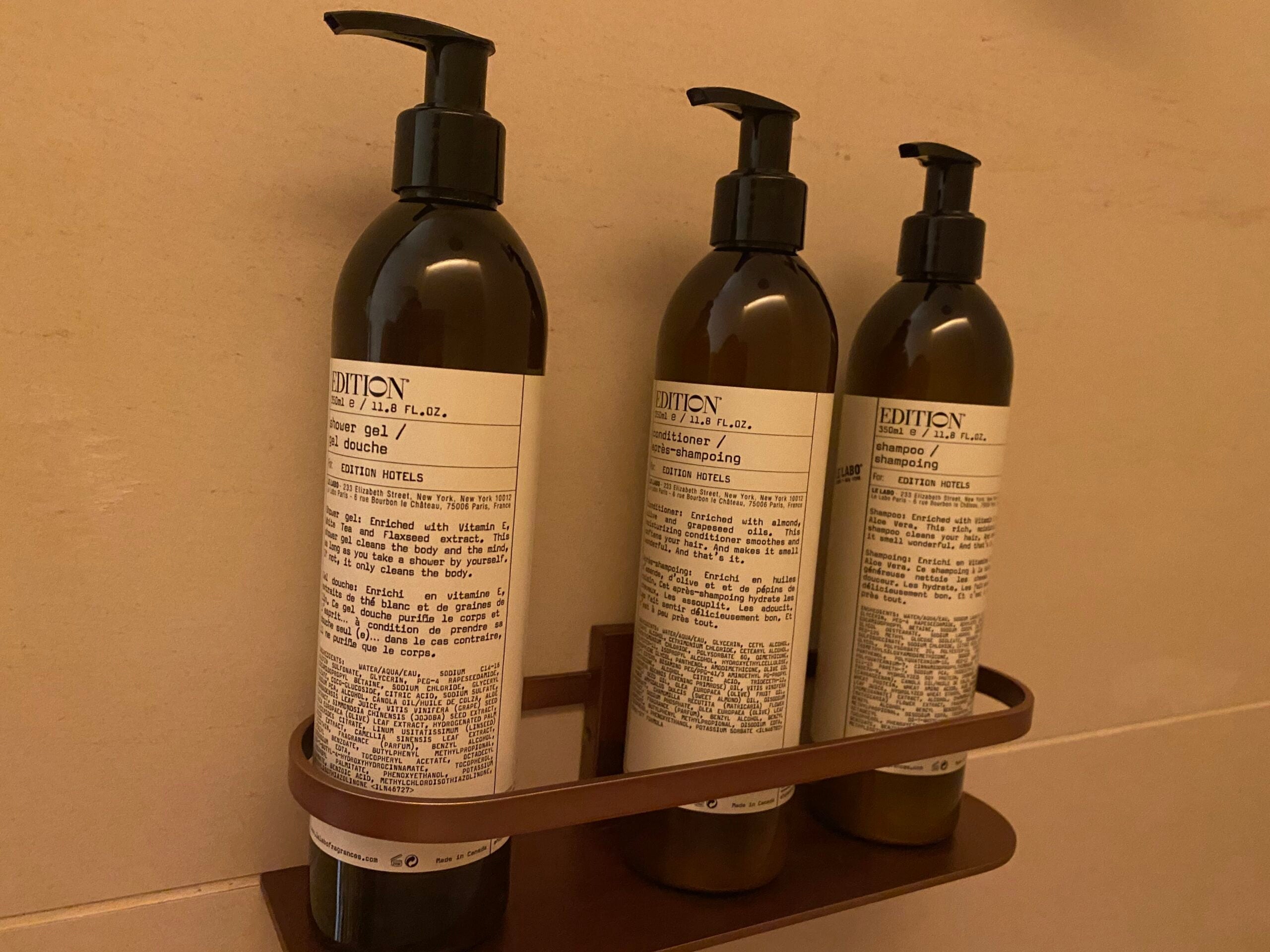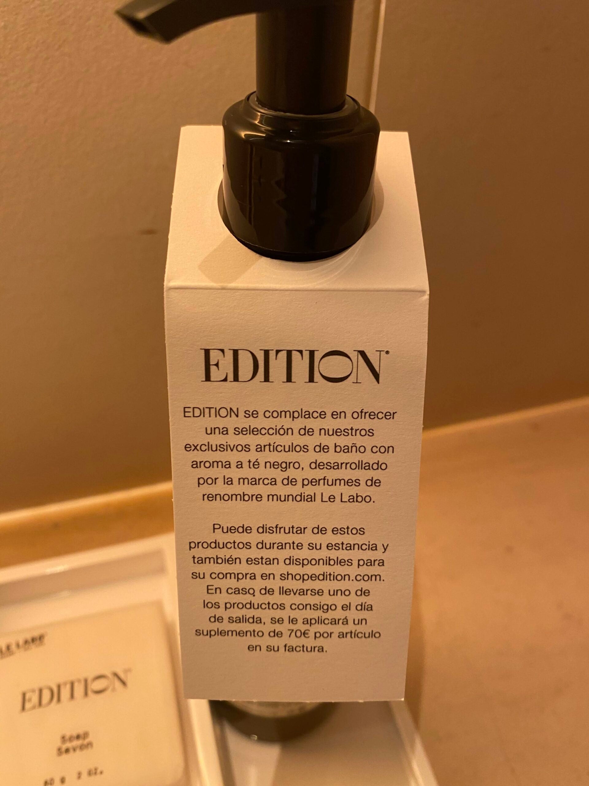 When it comes to the coveted Le Labo amenities with the signature Edition black tea scent, the hotel isn't providing single-use bottles. Instead, larger pump bottles of the Le Labo amenities were in the shower and on the sink. A small card placed on the sink bottle read (and only in Spanish, so future monolingual guests take note now) that anyone taking these bottles home with them will be charged 70 euros ($73) per bottle.