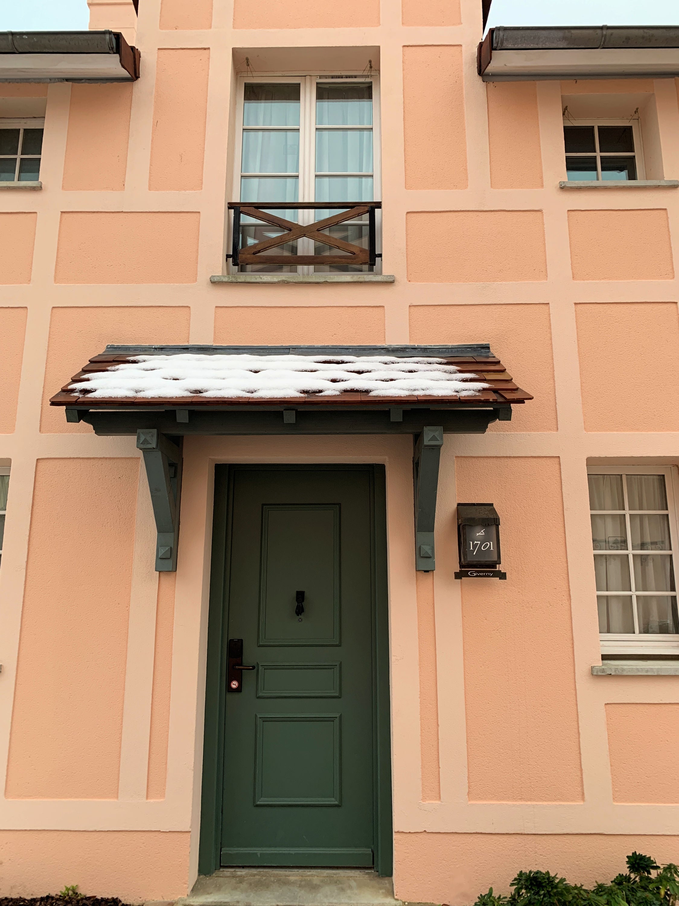At the rear of the unit was a set of French (what else?) doors. Our unit had a view of a small pond and the Disneyland Paris golf course. It also had a small metal table and two chairs that might have been lovely to relax on but were covered in snow during our stay. That said, we did see two hearty ducks and four even heartier golfers enjoying the great outdoors during our stay.