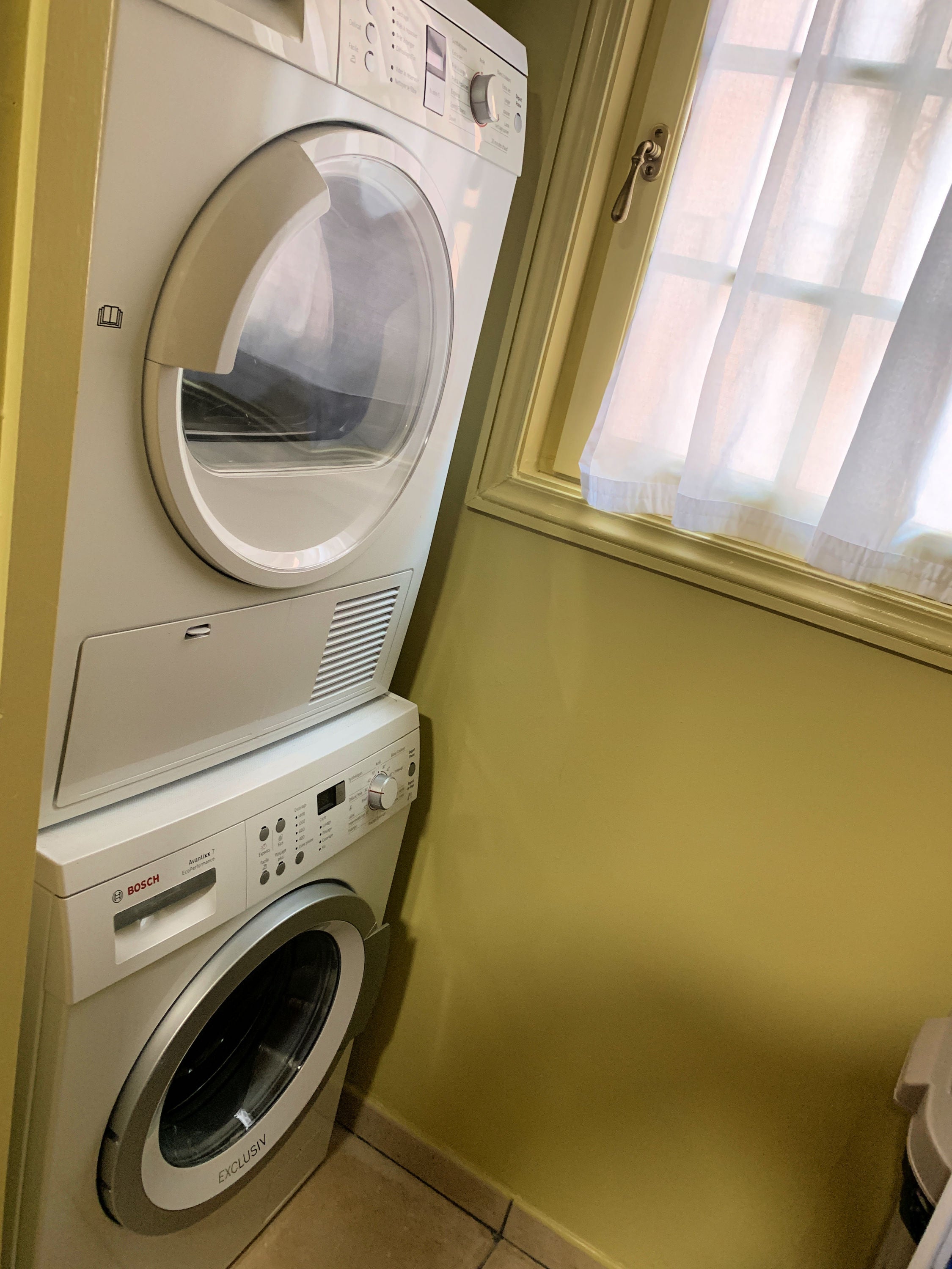 We opened the door and found ourselves in a two-story townhouse with the bedrooms and two full bathrooms upstairs. On the main level, we found a powder room, living room, dining room and kitchen with a small, granite bar handy for serving meals. We also were happy to see a full American-style washer and dryer, a rarity in European apartments. If you've ever done laundry in an all-in one that takes six hours to wash and dry a pair of jeans, you get what a treat the laundry was.