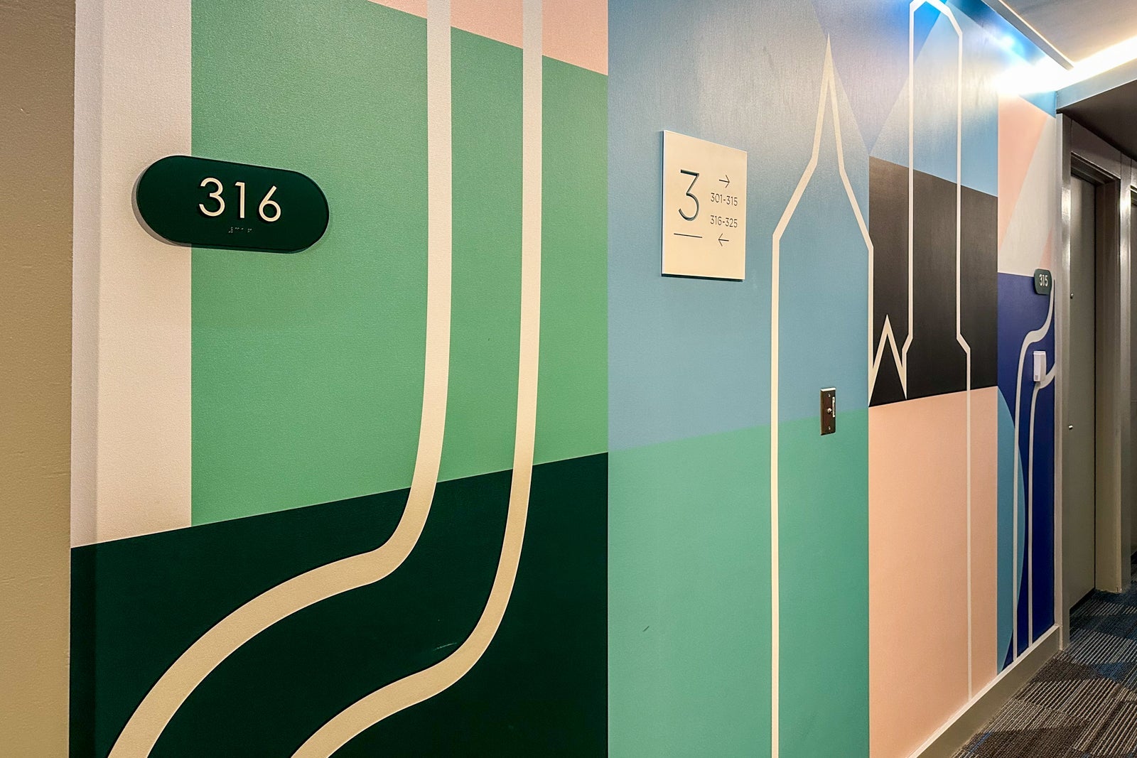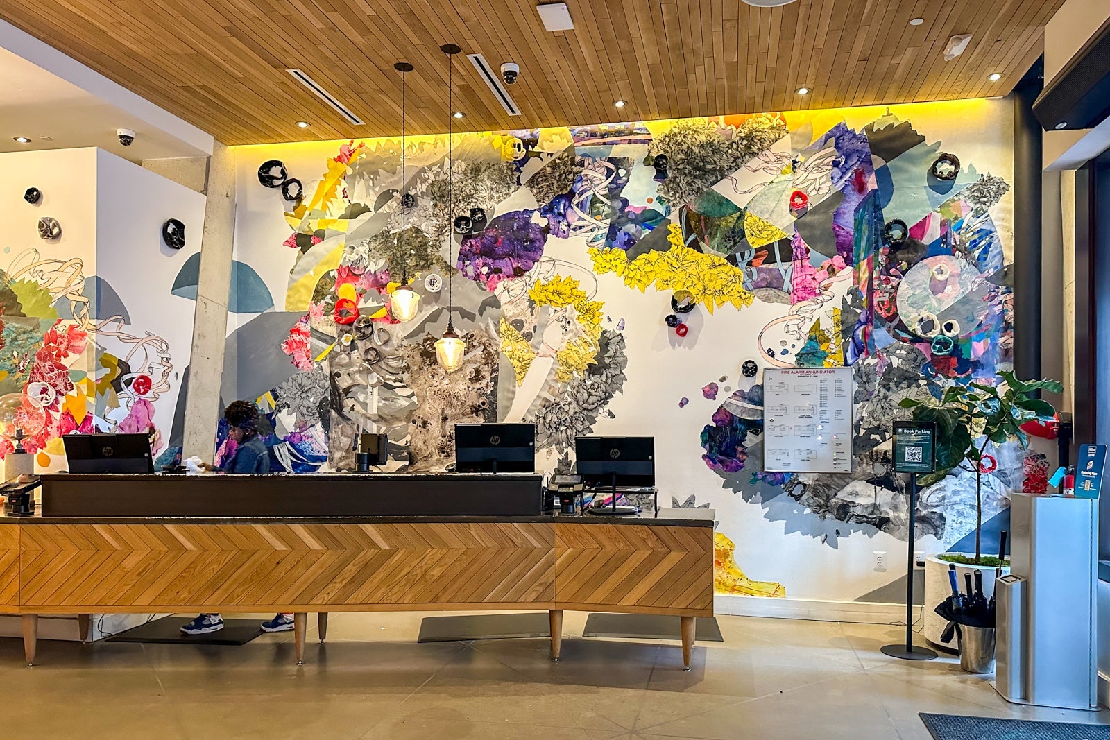 To enter the hotel, I had to ring a doorbell since I didn't yet have a key card to scan; so the Motto got points for safety right away. When I entered, I was greeted warmly by the receptionist and took a moment to look around at the impressive murals on the main walls of the lobby. I quickly realized, however, that the lobby was more for looking than for lounging. There was a bench along one wall and a few chairs, but they were easily overtaken by anyone waiting on a room or a ride.