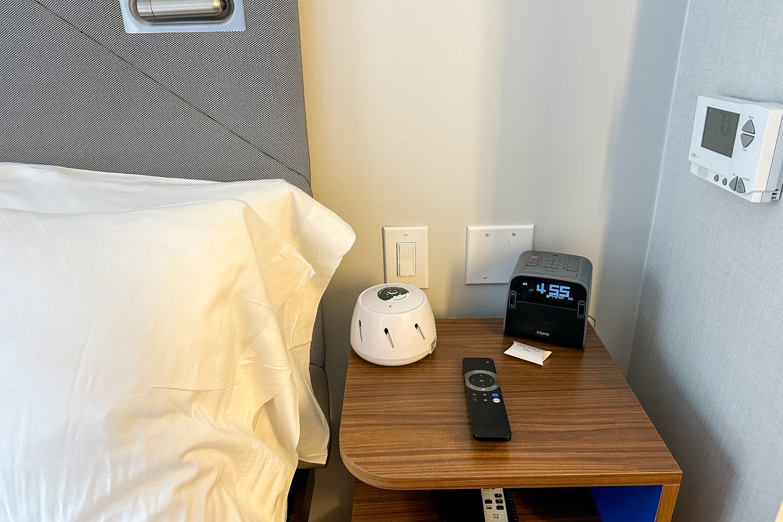 There was certainly no excess square footage, but I had what I needed: a comfortable bed with headboard-mounted reading lights, a bathroom, a flat-screen TV on the wall, a nightstand with a clock and plugs where I could put personal belongings, and even a (remarkably) small desk by the window to start working on this review. There was also a wall-housed air-conditioning unit. The urban-contemporary design made everything feel sleek, modern and efficient.