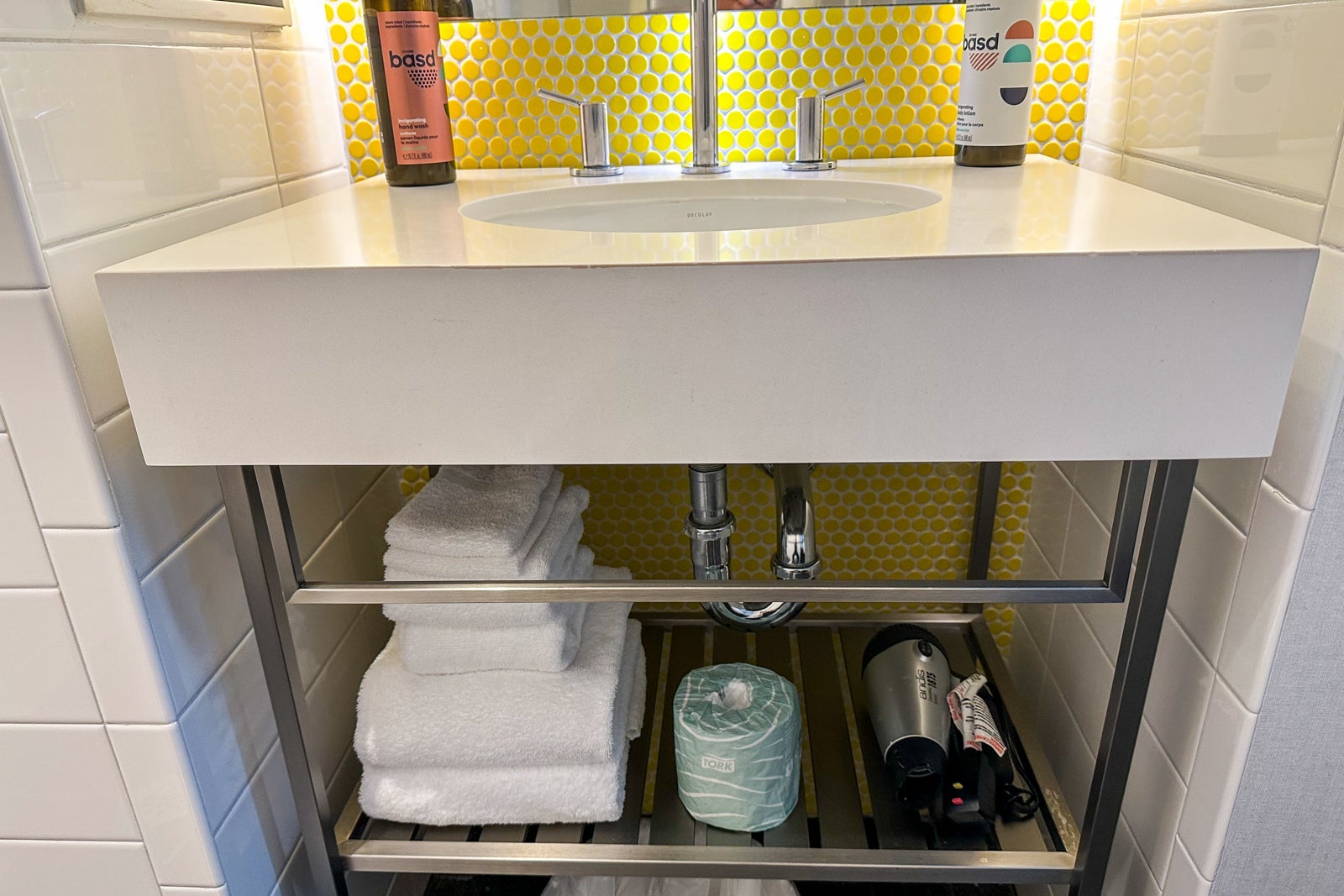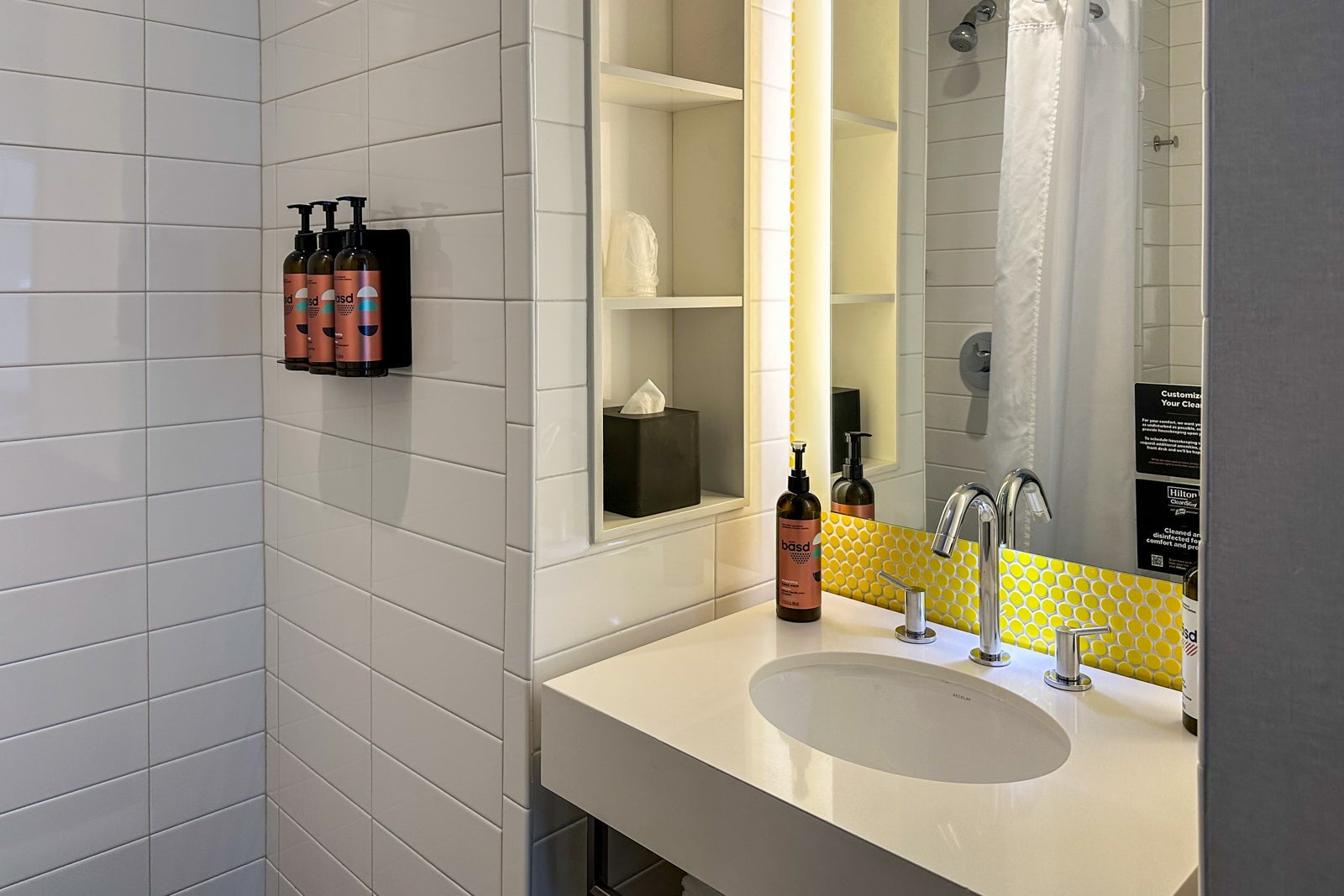 The bathroom was far from spacious, but it had a walk-in shower. There was enough space between the toilet and sink to stand and brush my teeth. There were also full-size plant-based Basd bath products for guests to use during their stay.