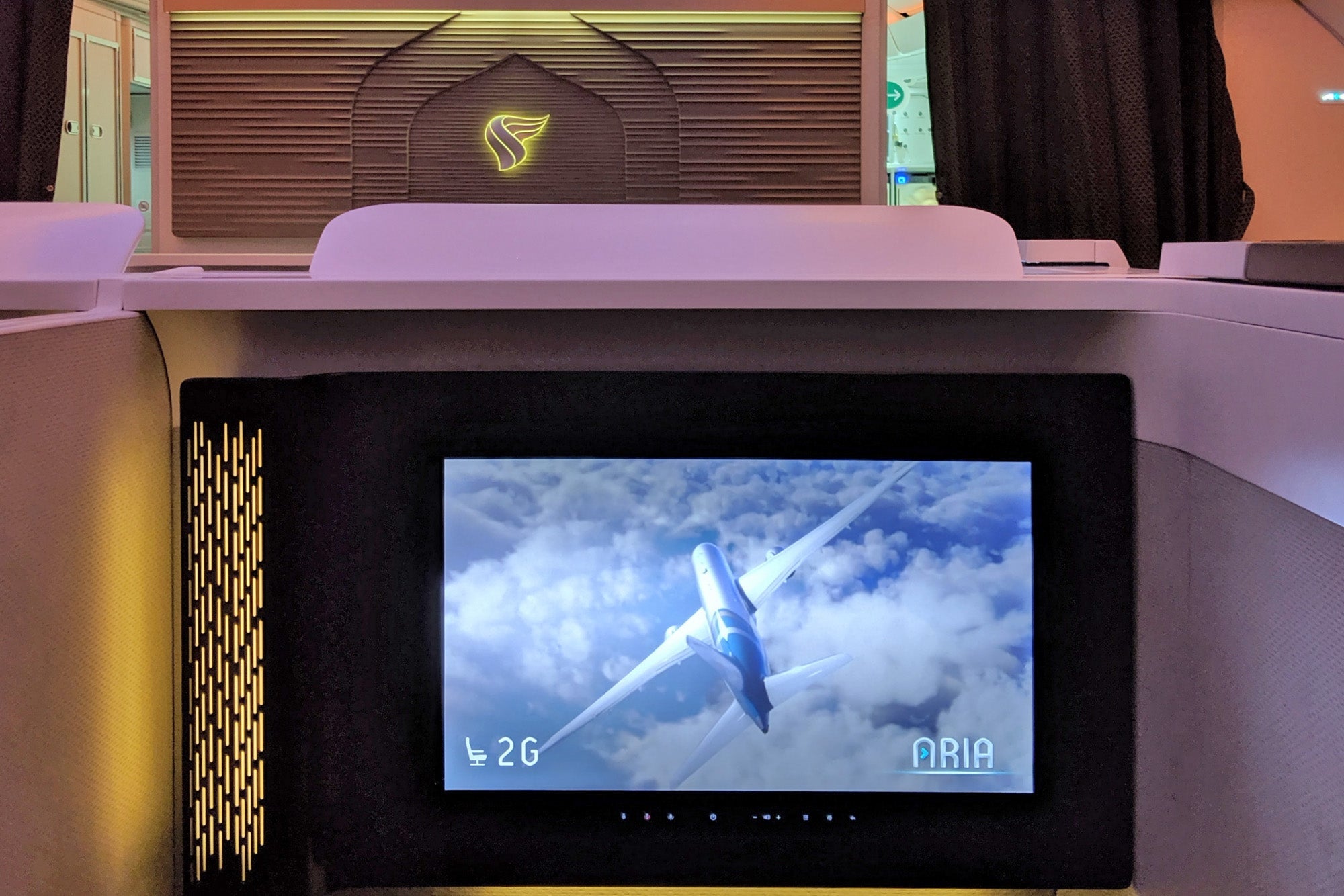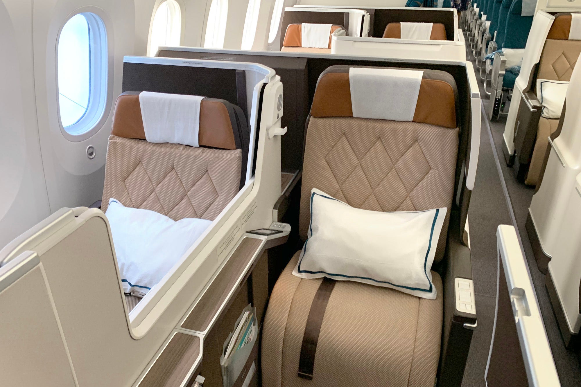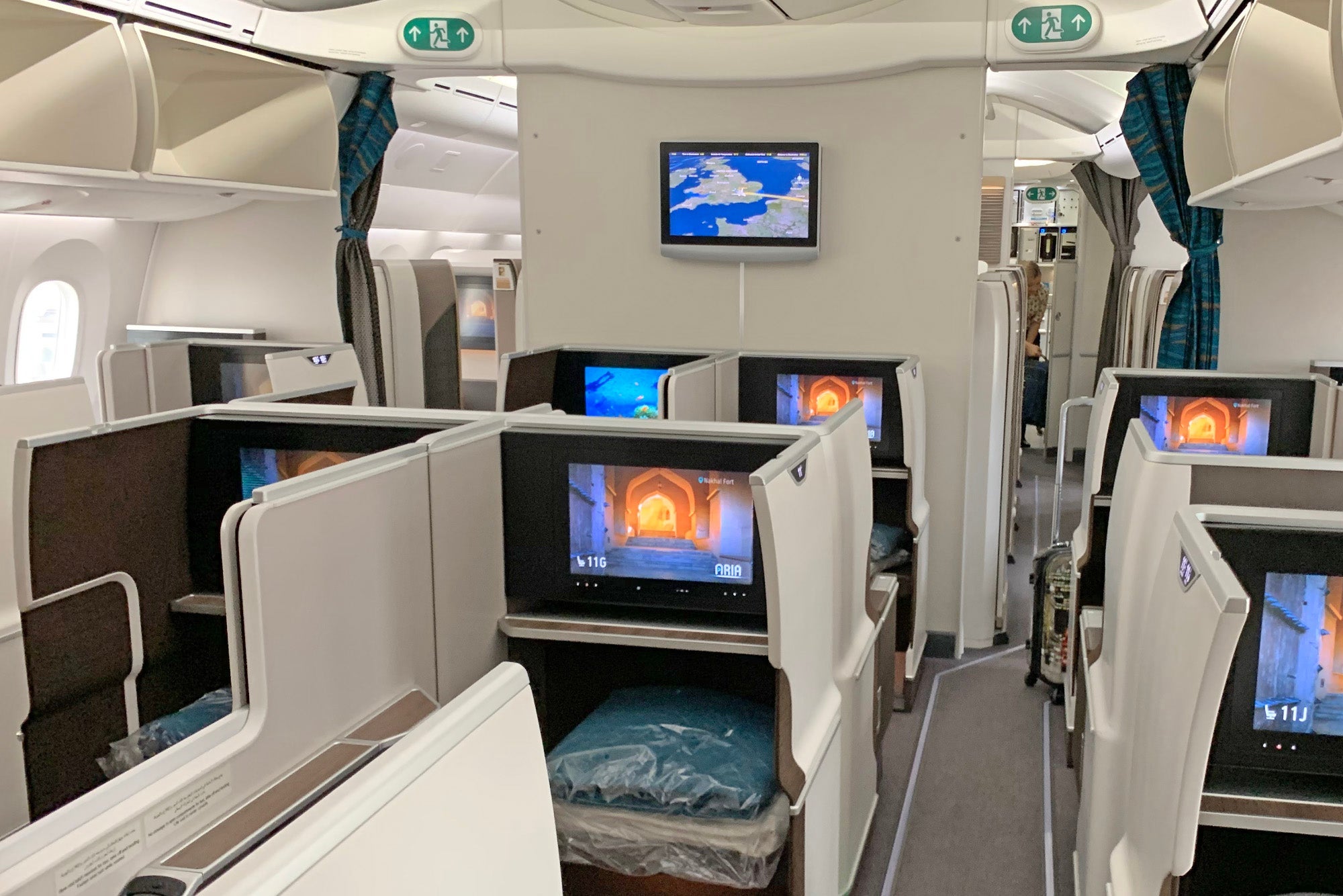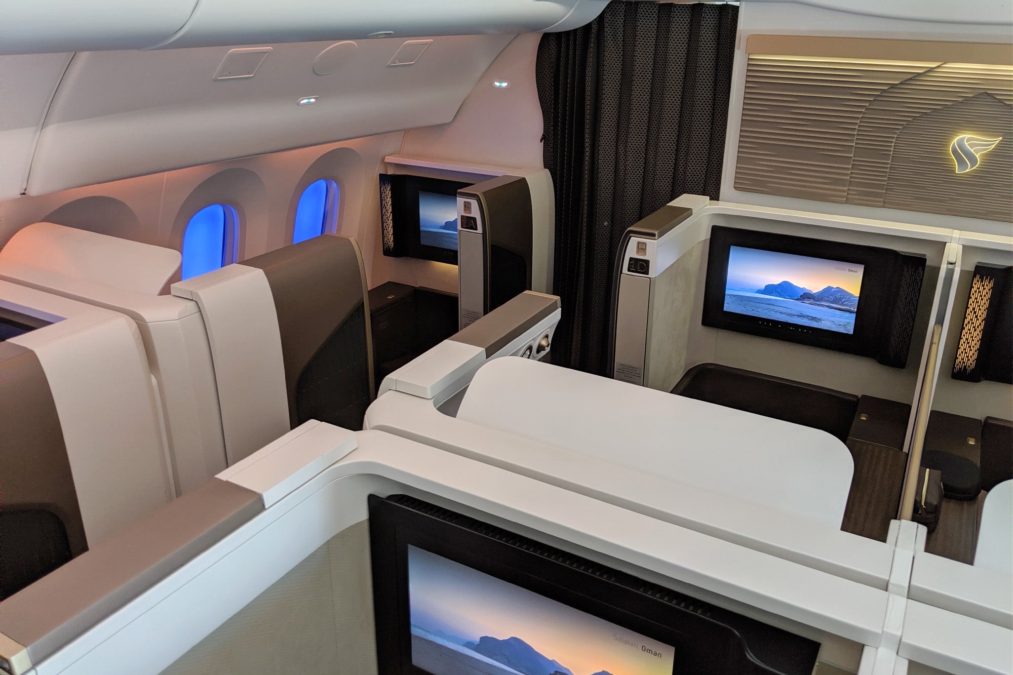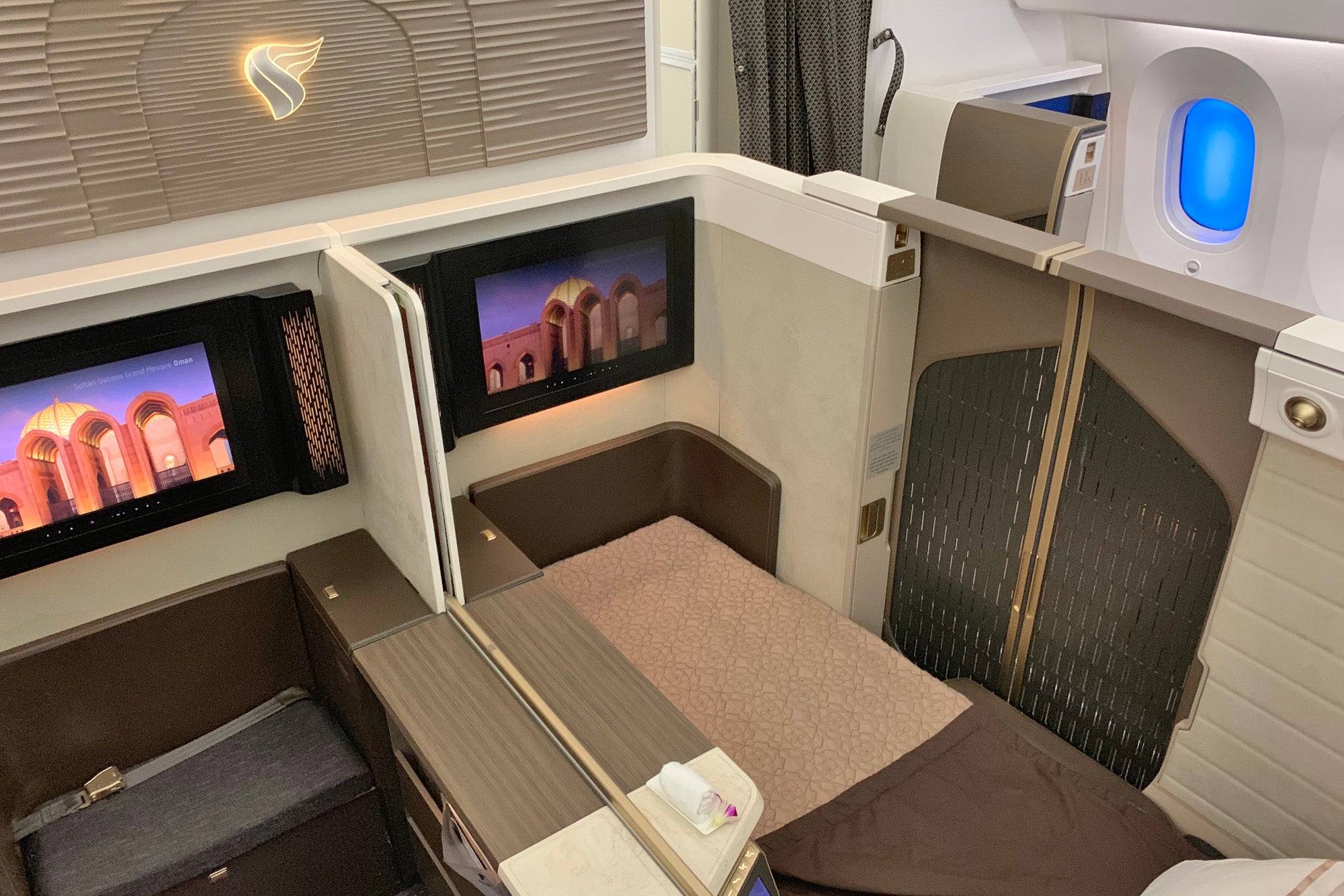 Oman's new business class offers excellent privacy, especially at window seats, but first class takes that to the next level — even with the doors open I needed to lean far forward to see across to the next suite.