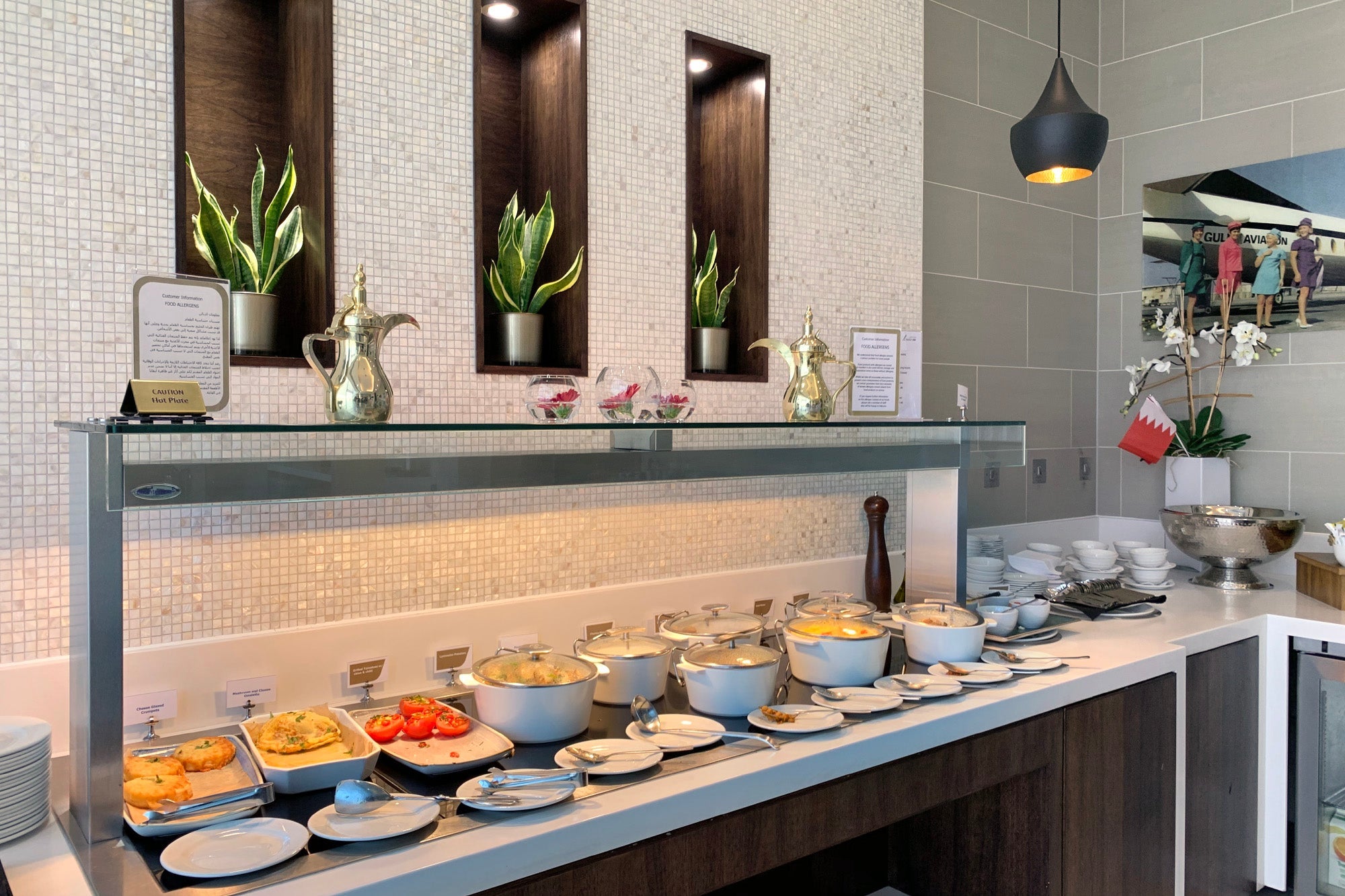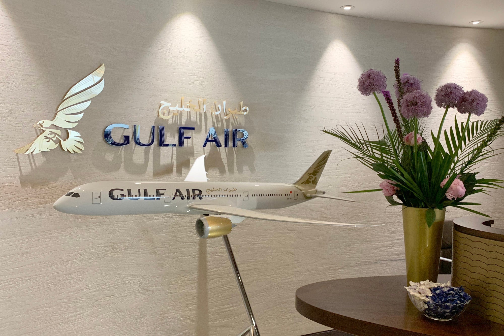A supervisor overheard the exchange and walked over. Realizing I was the one and only first-class flyer booked on the flight, she handed over my already-printed boarding passes for both flights, along with an invitation to the Gulf Air Falcon Gold Lounge that had already been filled out. Even better, she offered to walk me to the lounge, and given the bad luck I've had with overlooking small liquids at LHR security in the past, I gladly accepted the escort.