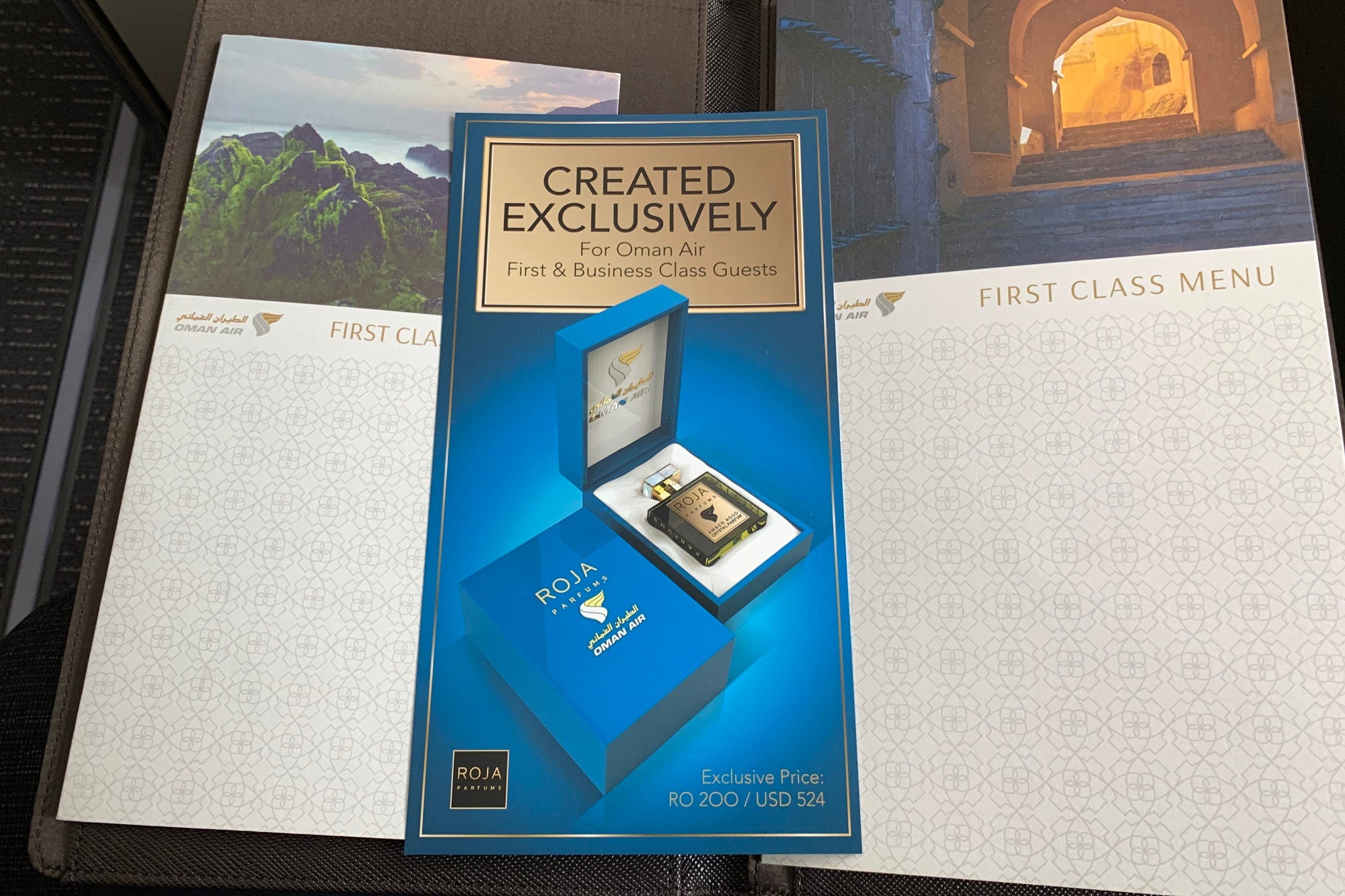 The menus came in a pristine leather folder, alongside an offer for a special premium-cabin fragrance with an "exclusive price" of $524.