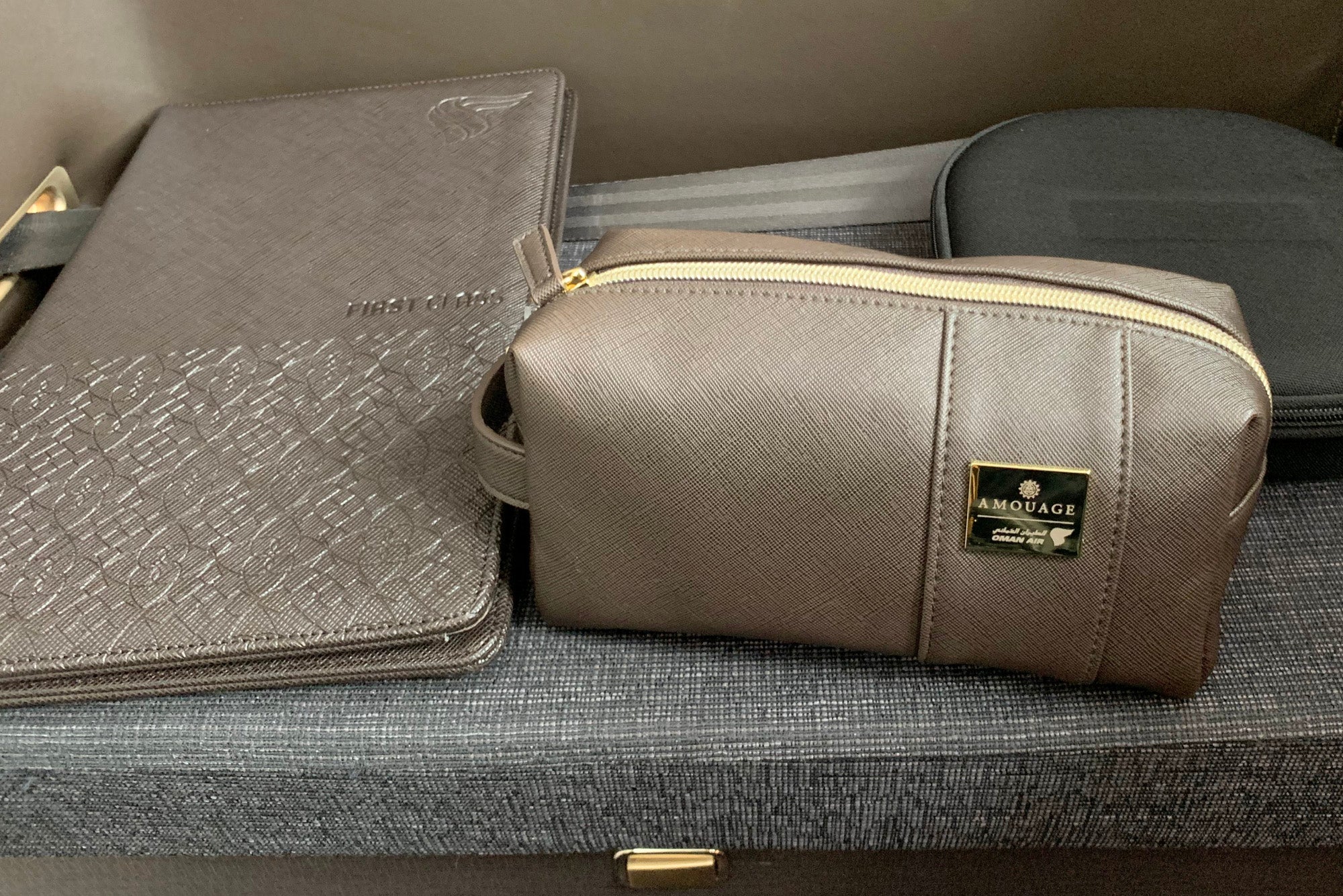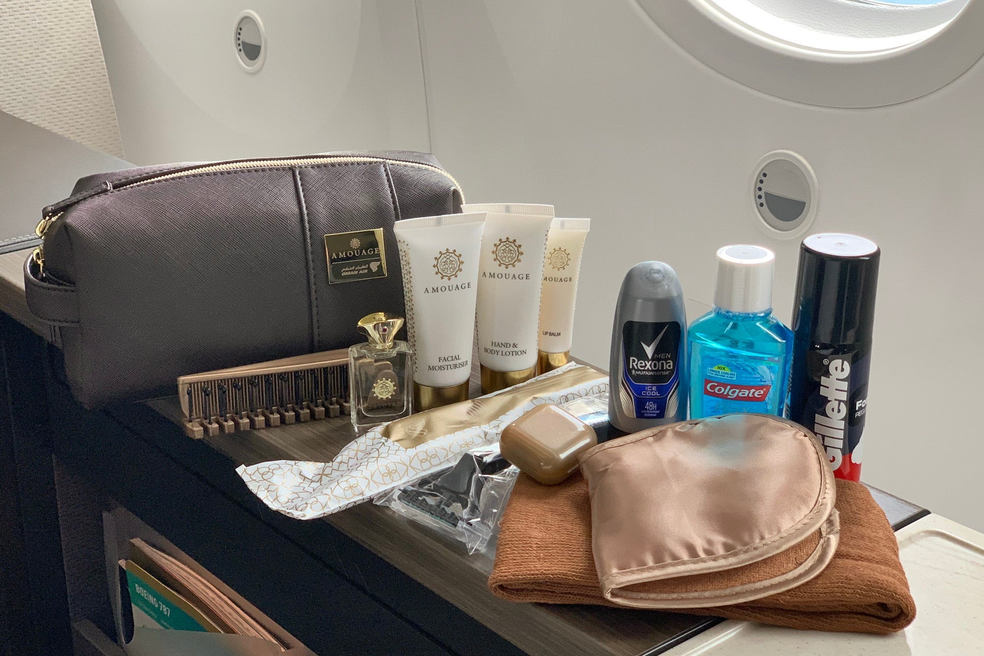 First, a flight attendant handed me a large pouch from Oman-based Amouage, stuffed to the brim with essentials and bonus items, like a hairbrush and perfume.