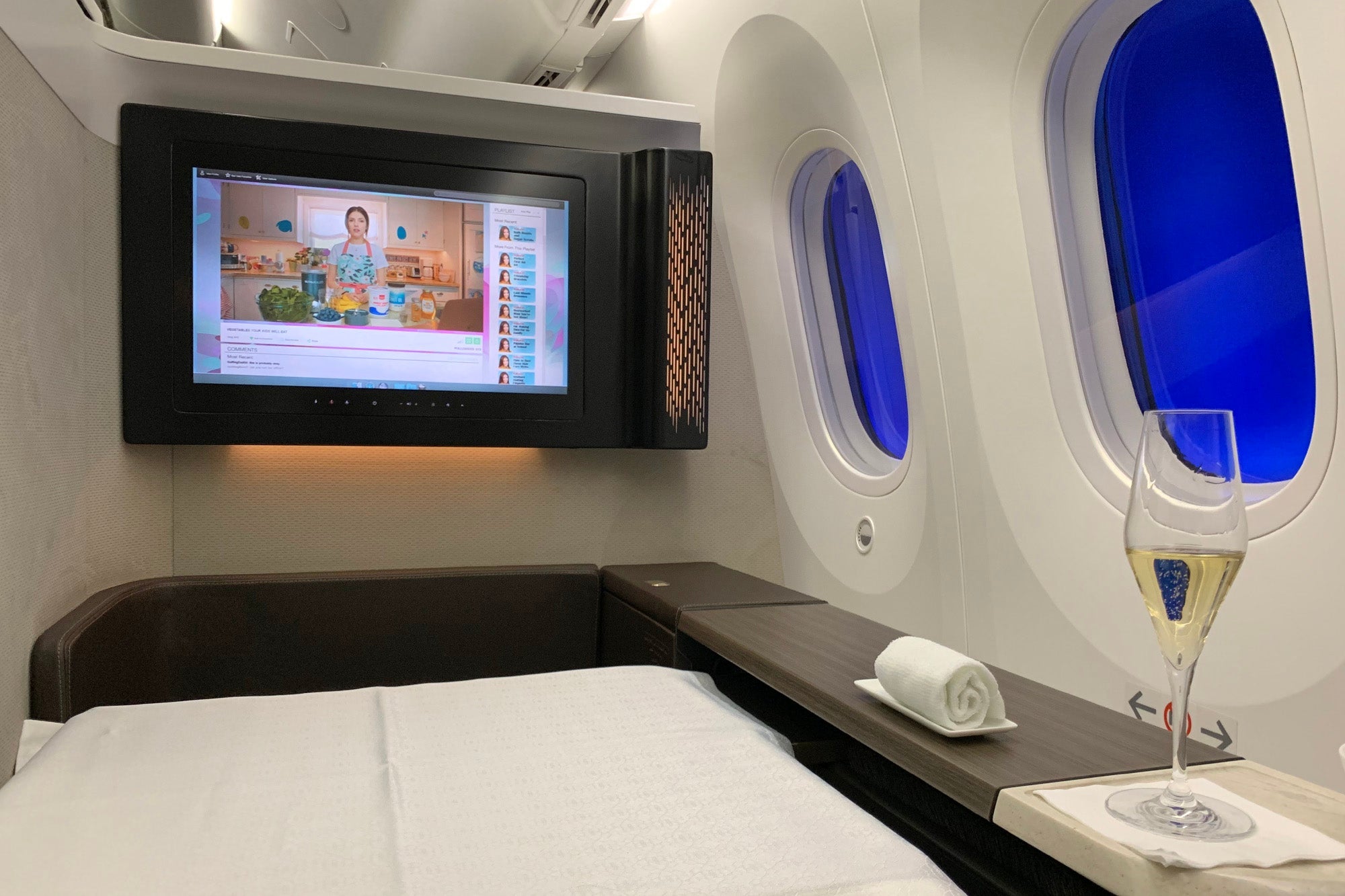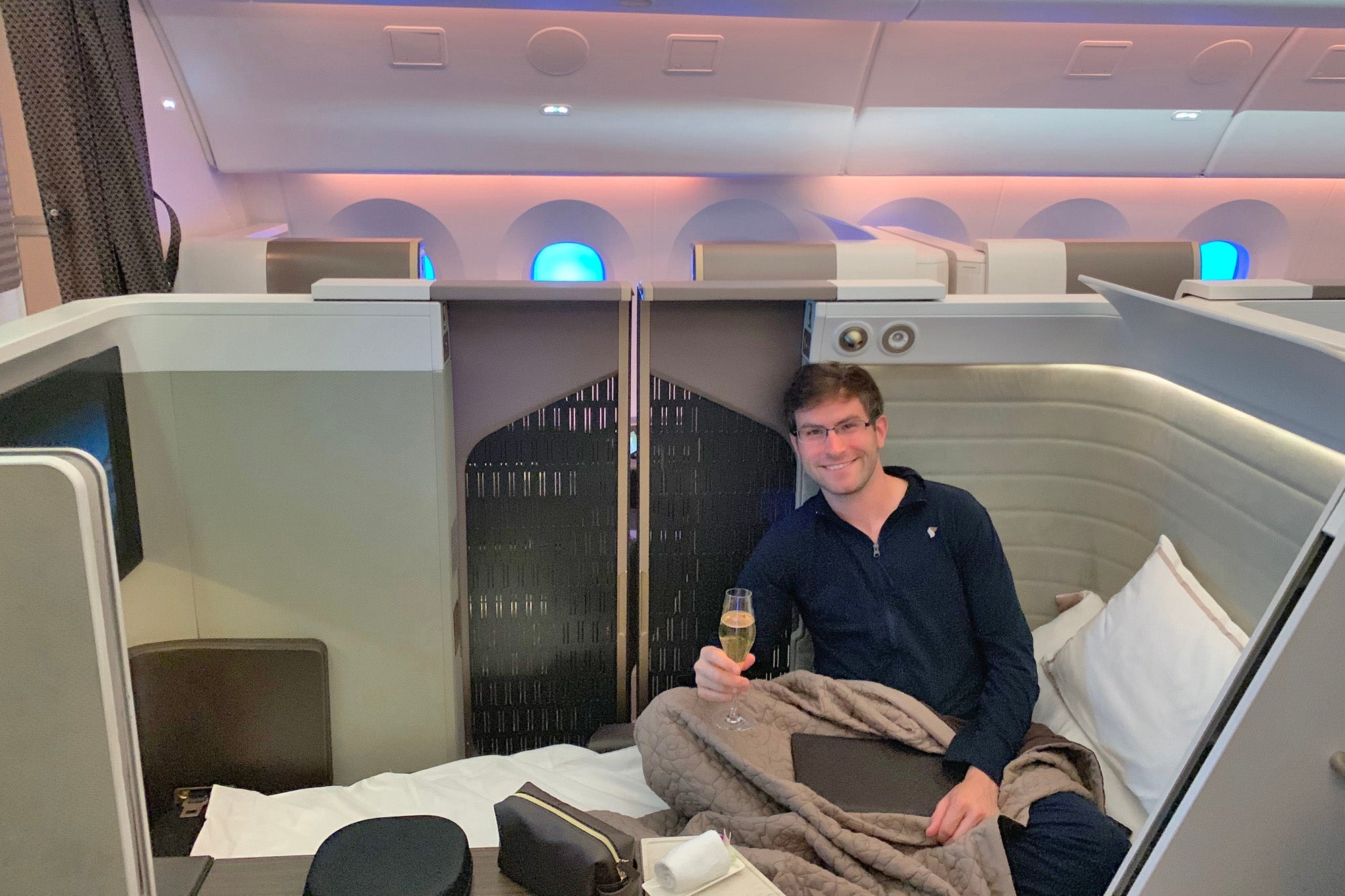 Did you notice something different about this review? Yeah, aside from the multisuite setup, there were a number of photos of me — not easy to accomplish when you're flying solo. As it turns out, someone at the airport gave the purser a heads up that a "social media person" was on board — presumably from searching my name before check-in.