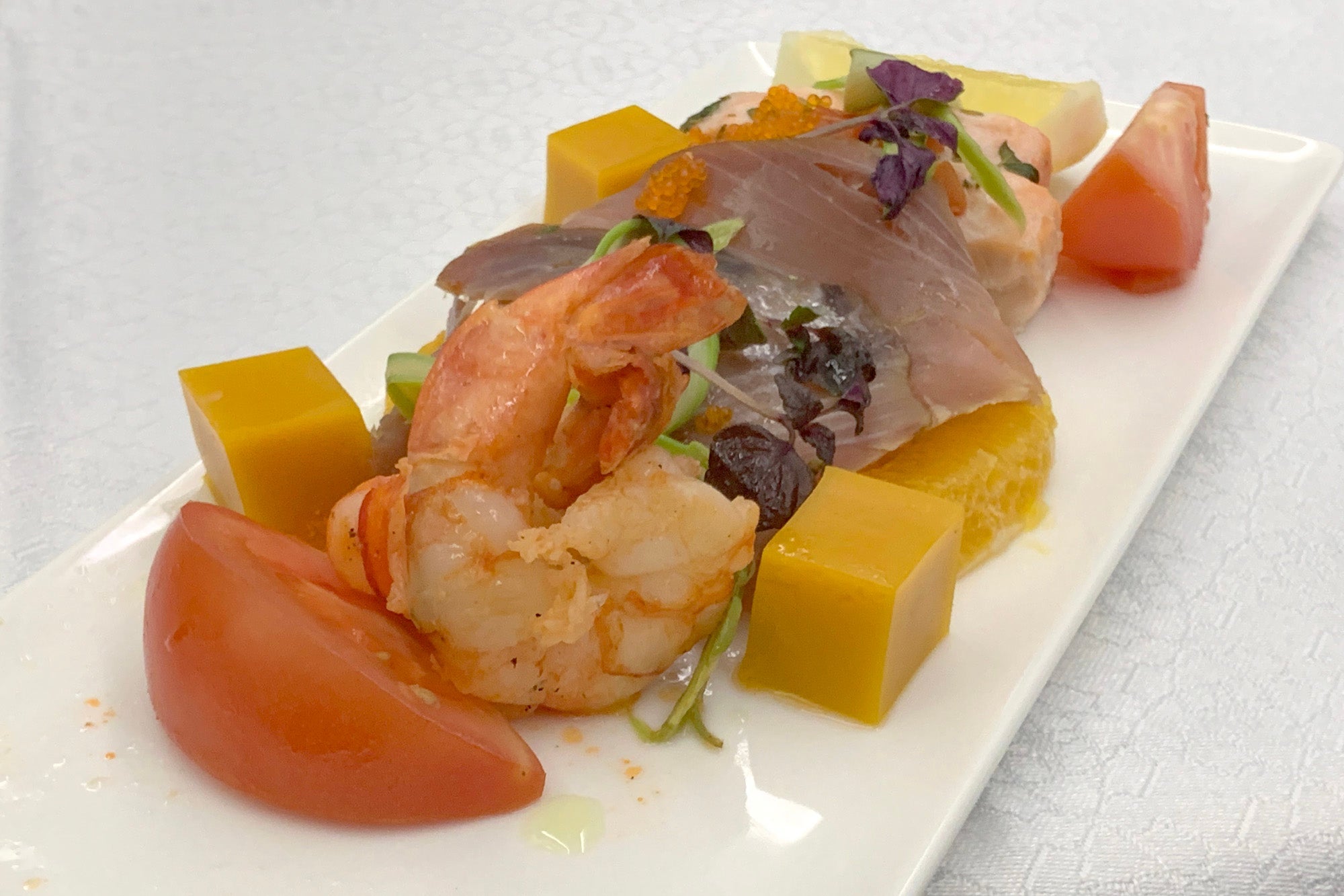 Next, I started with a marinated prawn, smoked tuna and sous-vide salmon appetizer, which was served with freshly ground pepper.