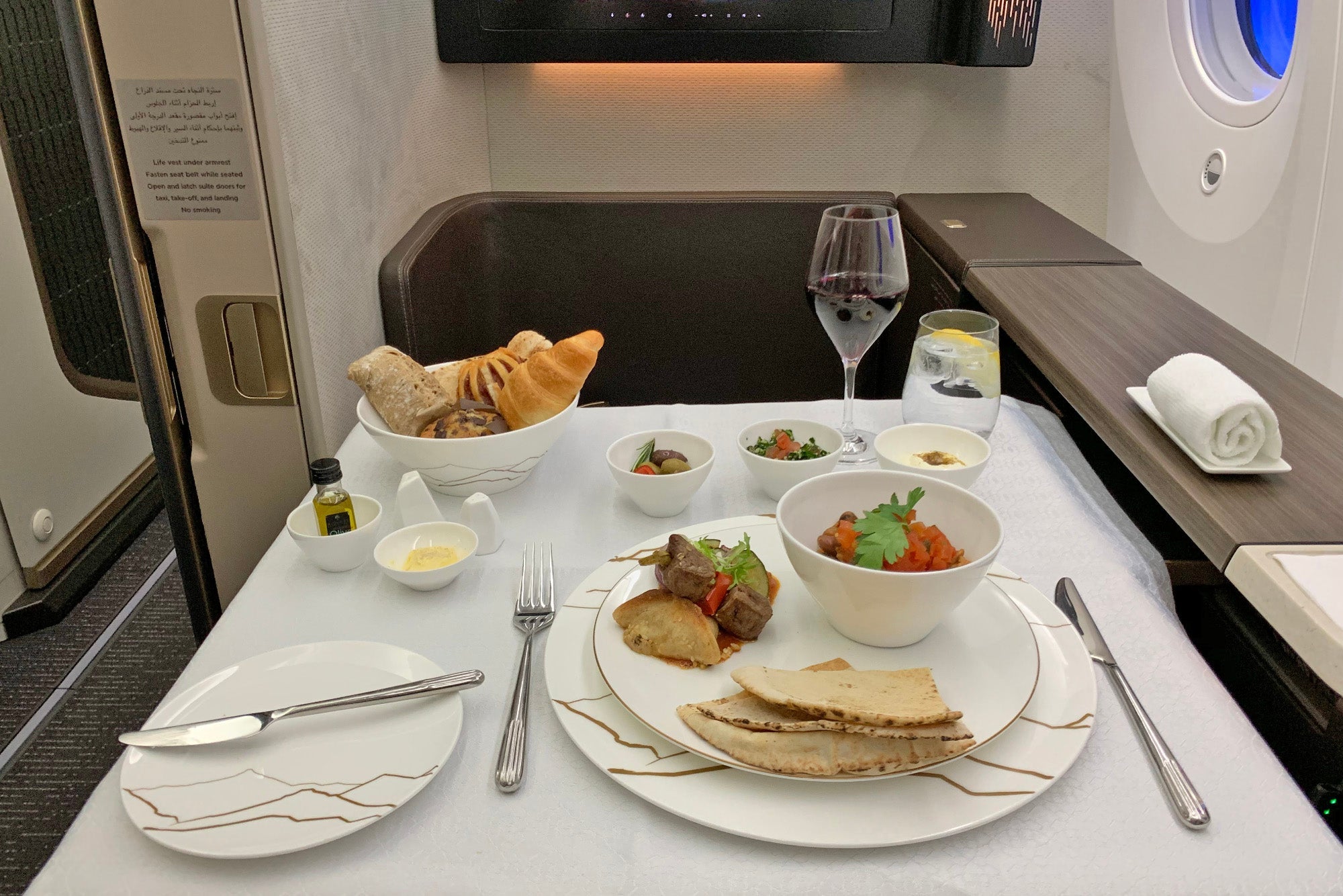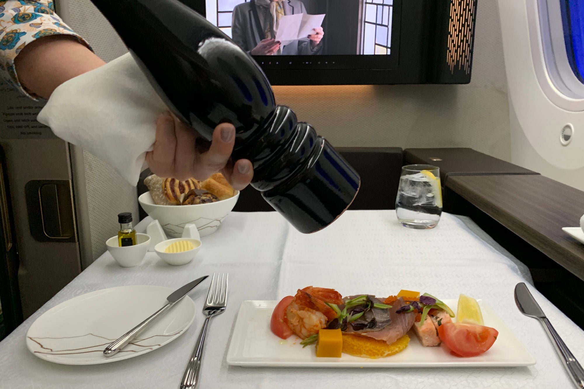 [tpg_rating tpg-rating-score="94" ground-experience="9" cabin-seat="25" amens-ife="14" food-bev="21" service="25" pros="Empty cabin, incredibly friendly crew, great amenities, chilled minibar, good food and beverage options, large IFE selection." cons="No caviar on breakfast flights, sluggish Wi-Fi, downgraded on connecting flight." /]