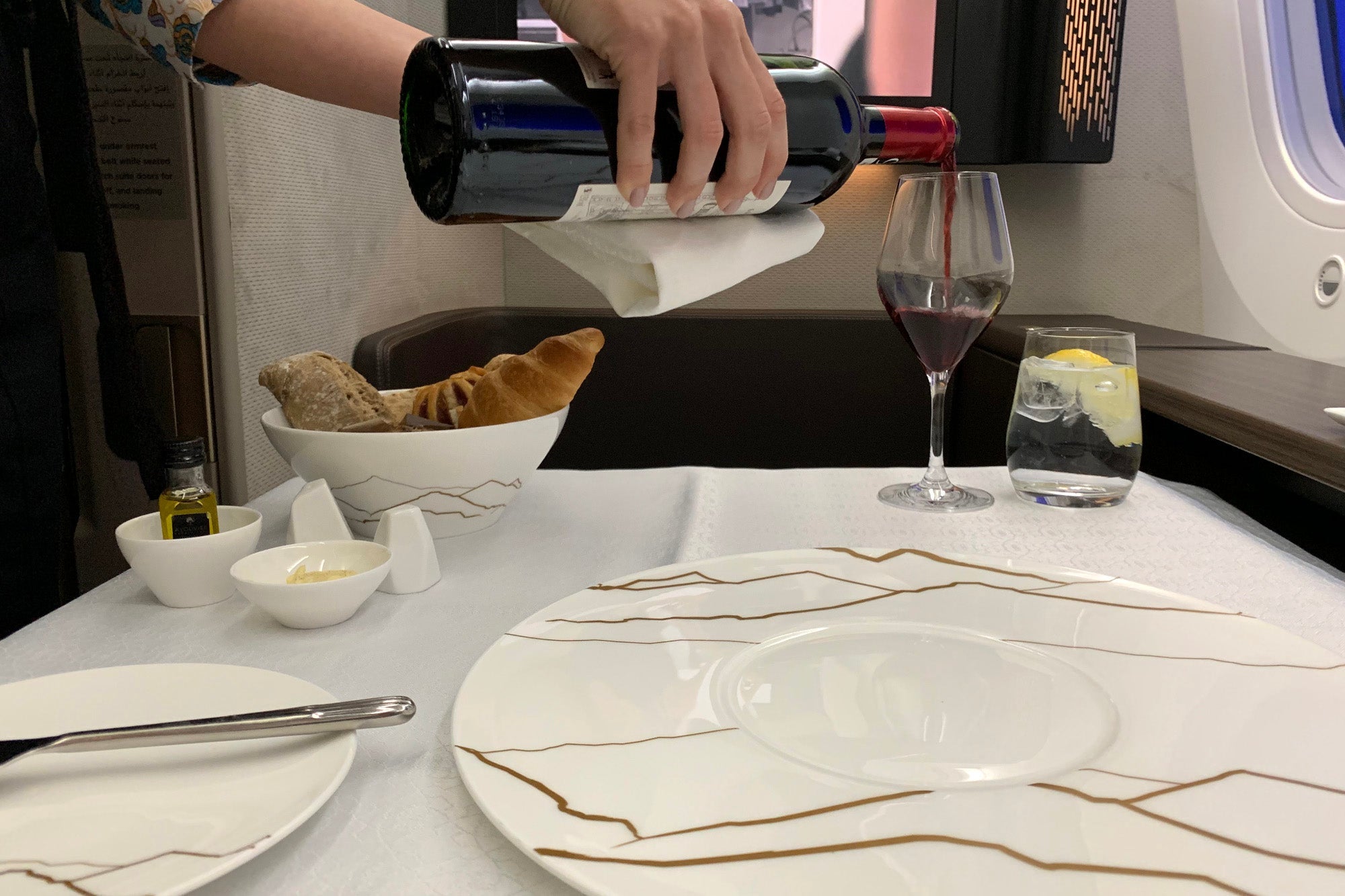After another glass of Champagne, I switched to Bordeaux for my main course. The crew poured me a taste so I could make sure it wasn't corked after opening the bottle, which I appreciated.