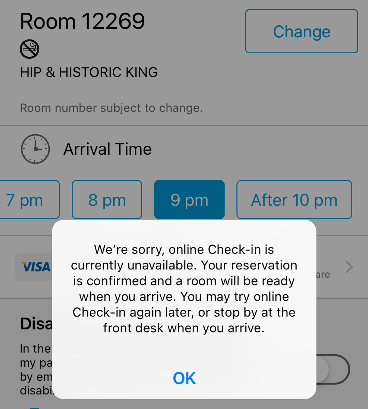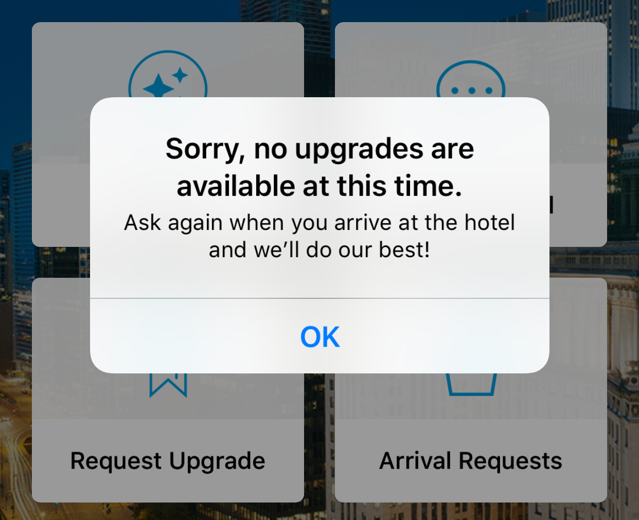 With my Honors number attached, I was able to complete the check-in process directly through Hilton's mobile app — or so I thought. Naturally, my first tap was the "Request Upgrade" button, which generated the following pop-up: