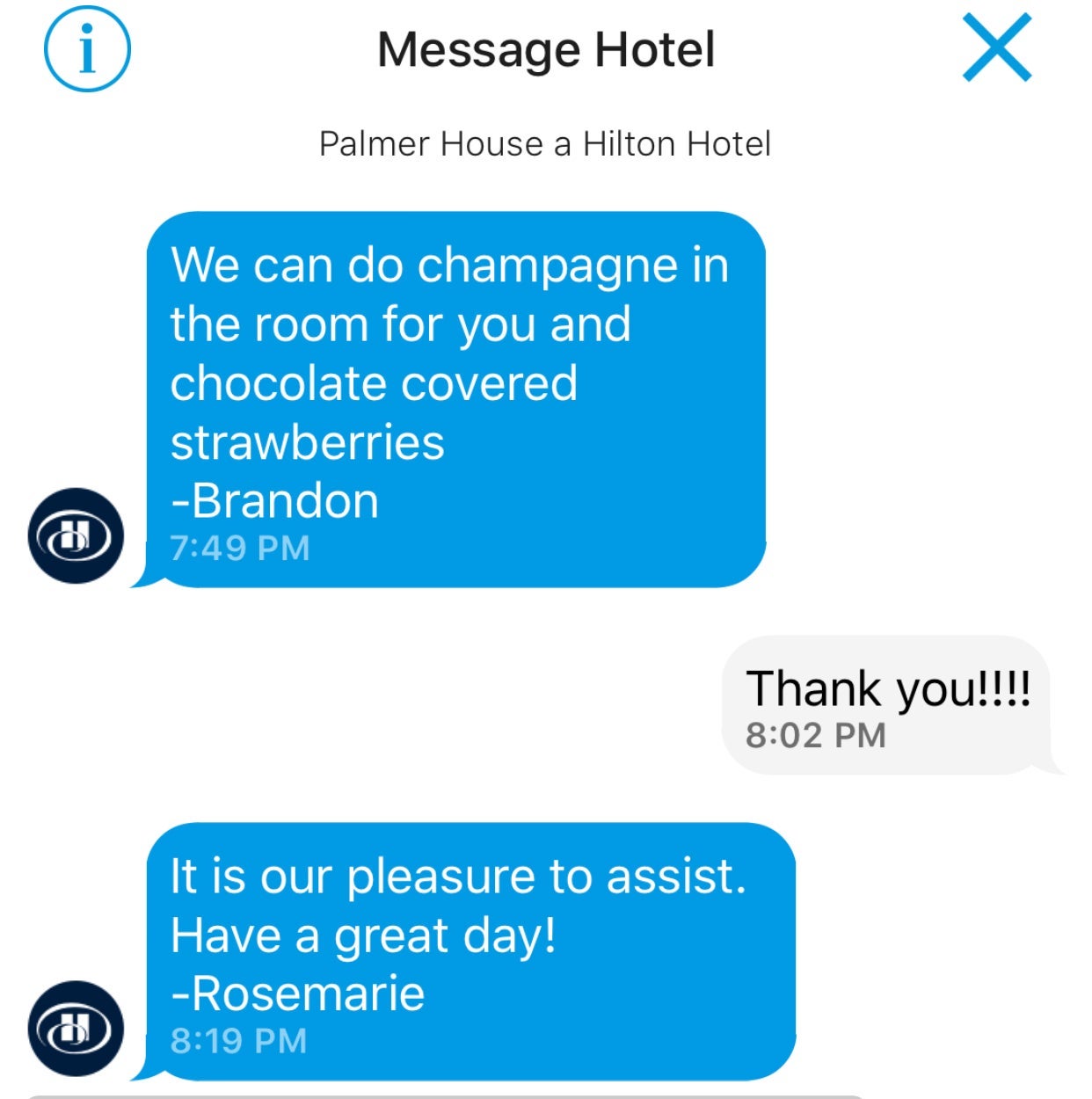Aside from the upgrade and free buffet, having the staff add my Honors number also let me text the hotel through the Hilton app — a great feature, at least in theory. I always received a response within a few minutes, but several confirmed requests never materialized, such as the robes I ordered and the Valentine's Day welcome I confirmed before arrival.
