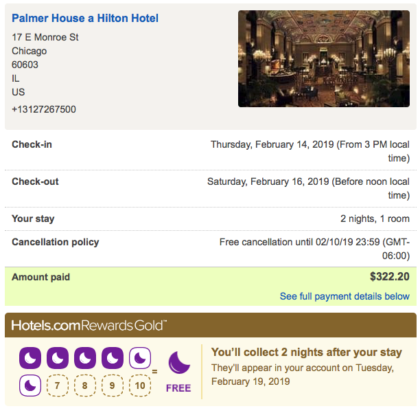 We booked the first two nights of the stay via Hotels.com, so TPG could collect night credits and 10x miles with his Capital One Venture Rewards credit card, at a total cost of $322, including taxes and fees. Since I had a wedding to attend at the hotel over the weekend, I booked a third night directly with Hilton in order to maximize my Diamond benefits — a perk of the Hilton Honors American Express Aspire Card — and earn points within the Hilton Honors program, instead.